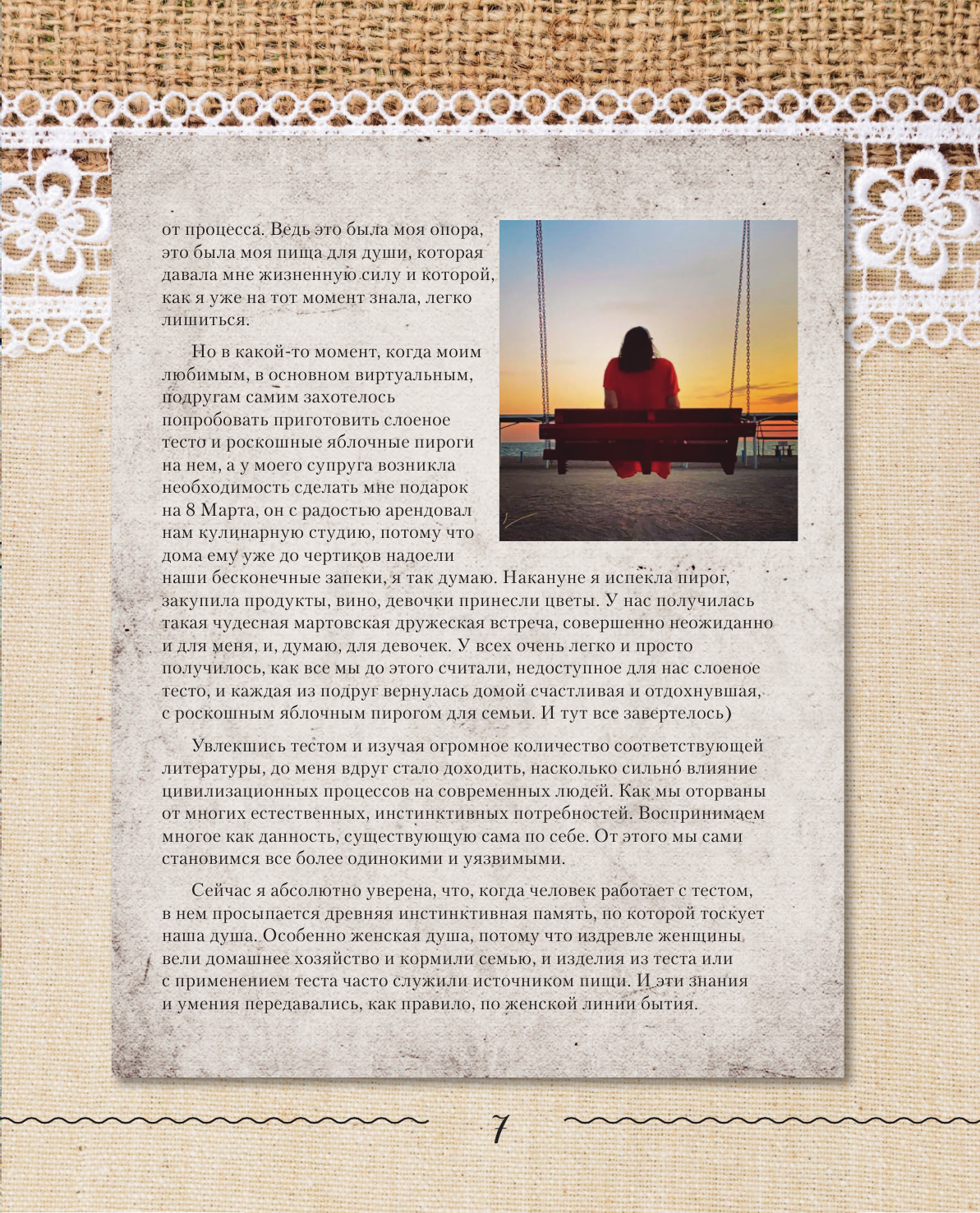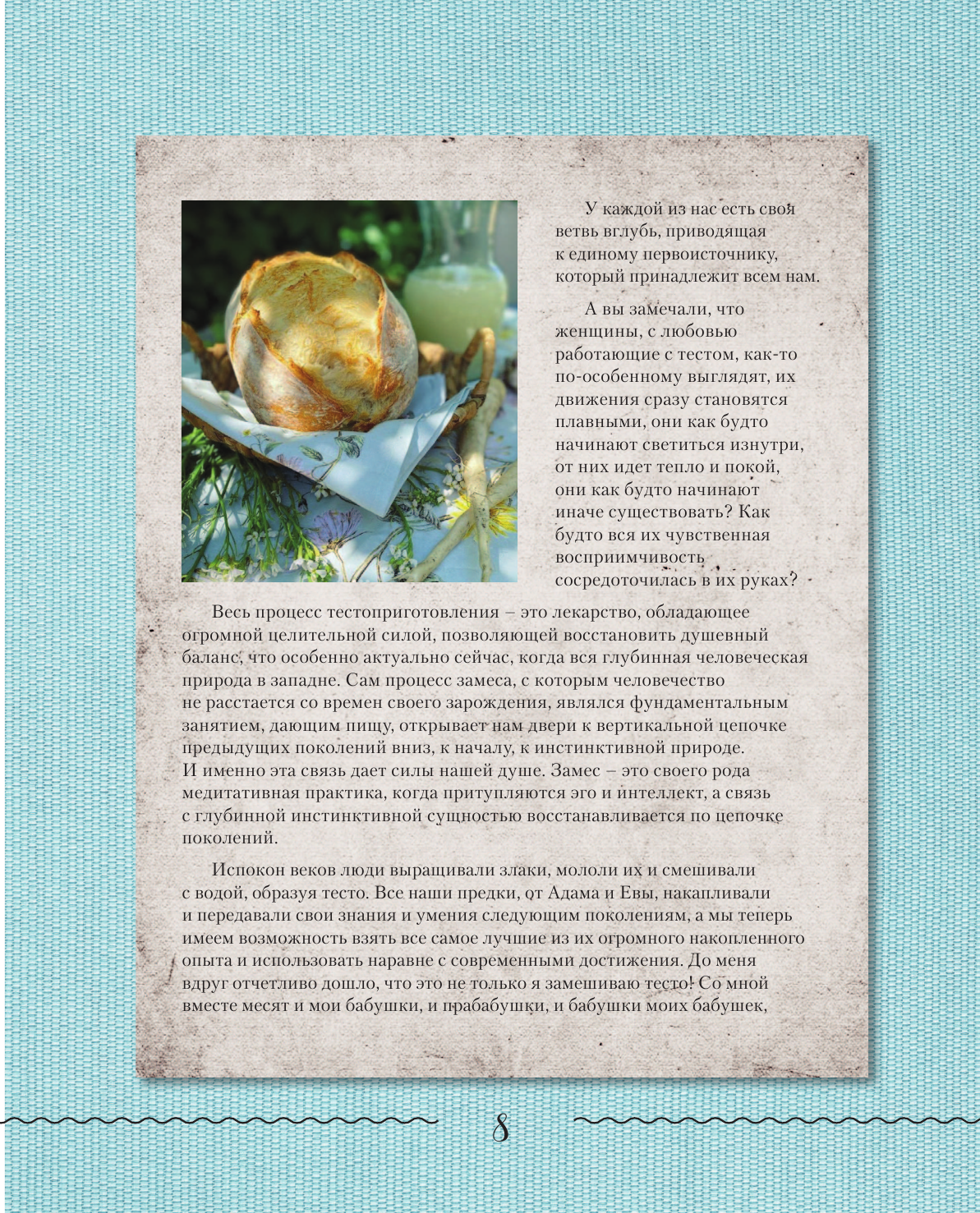 Тесто сейчас в опале, от него много бед, говорят. Но как иначе, чем не пирожком, успокоить расплакавшегося ребенка? Как угостить и удивить большую семью, чем не домашним наполеоном? Автор в этом мастер: в замесе, в раскатывании, в расстойках, в рецептах, в разговорах о муке, тесте. Терапий совместных посиделок с ягодным мильфеем. Ведь получаются после уроков Татьяны и рецептов: круассаны, "улитки", "биф-веллингтон", открытые ягодные тарты, чебуреки. Процесс принятия женской тактильной мучной сущности проходит заметно и ярко, будто все прародительницы мира находятся в связи с тобой, когда ты решаешь испечь что-нибудь по рецептам из этой книге. Чистое колдовство, с помощью воды и муки, дрожжей и масла.