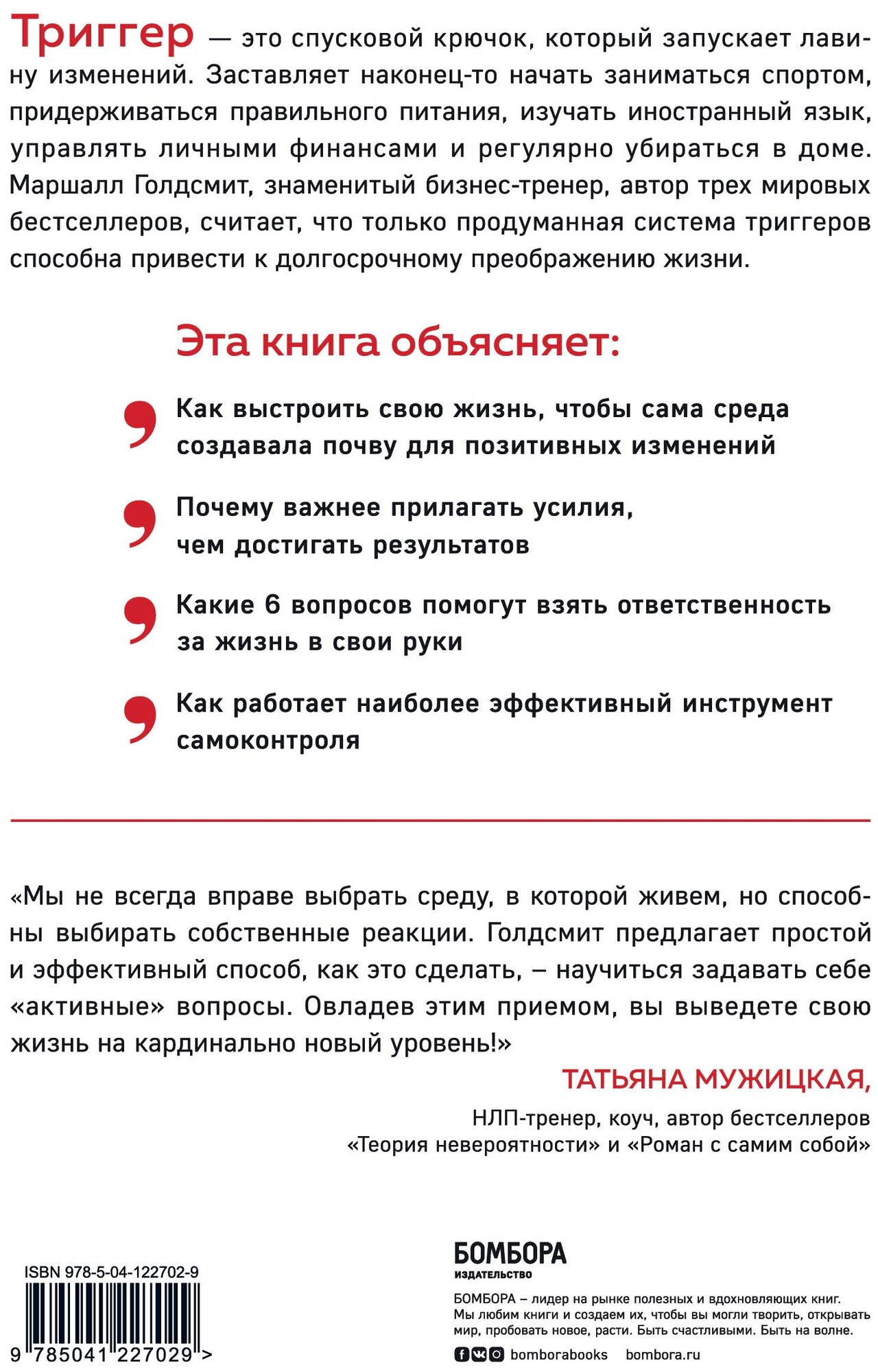Триггер — это спусковой крючок, который запускает лавину изменений. Заставляет наконец-то начать заниматься спортом, придерживаться правильного питания, изучать иностранный язык, управлять личными финансами и регулярно убираться в доме. Маршалл Голдсмит, знаменитый бизнес-тренер, автор трех мировых бестселлеров, считает, что только продуманная система триггеров способна привести к долгосрочному преображению жизни.