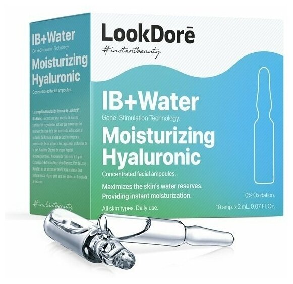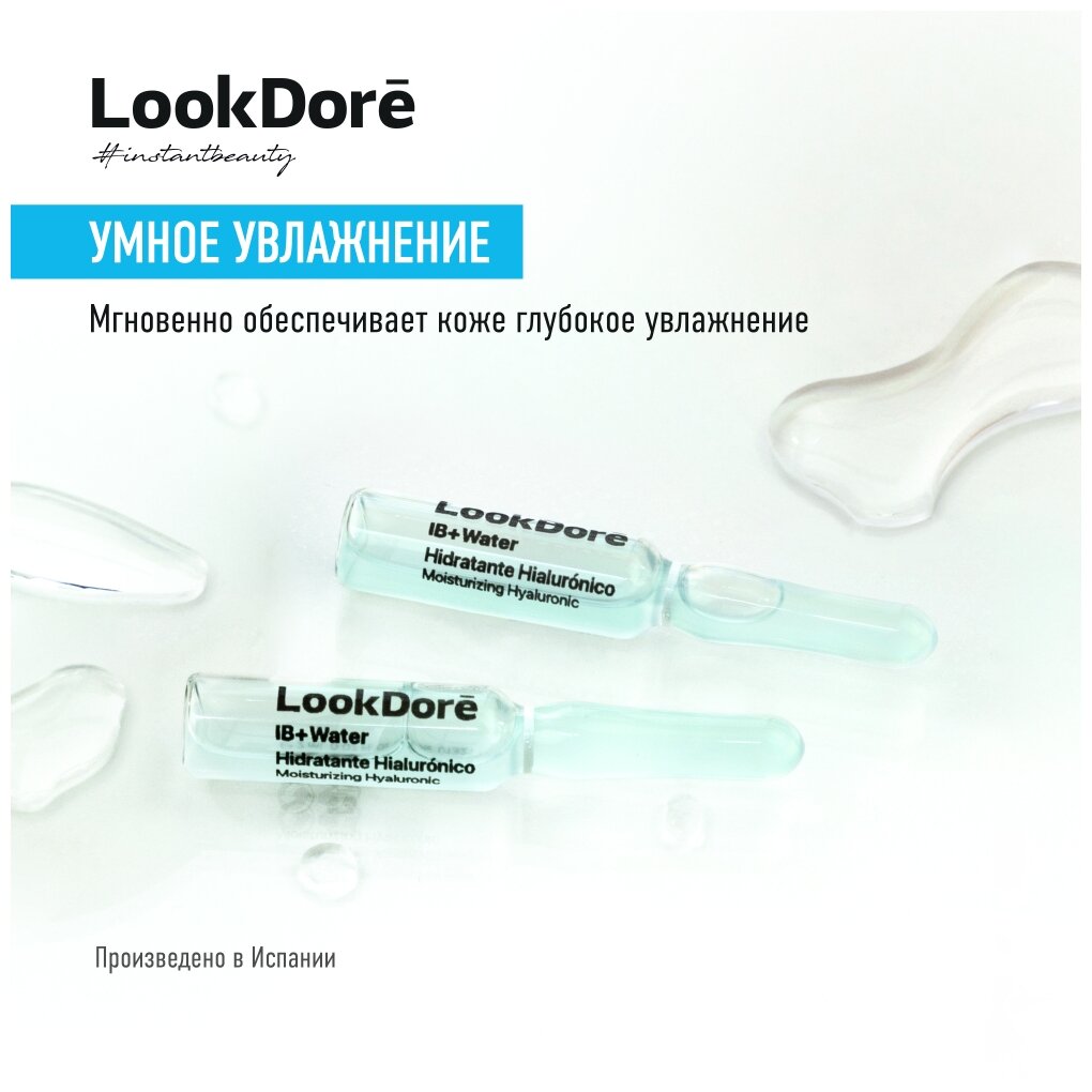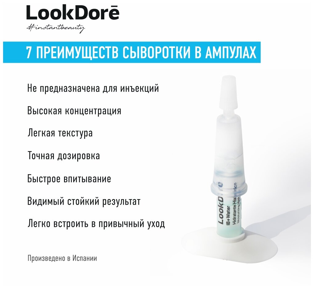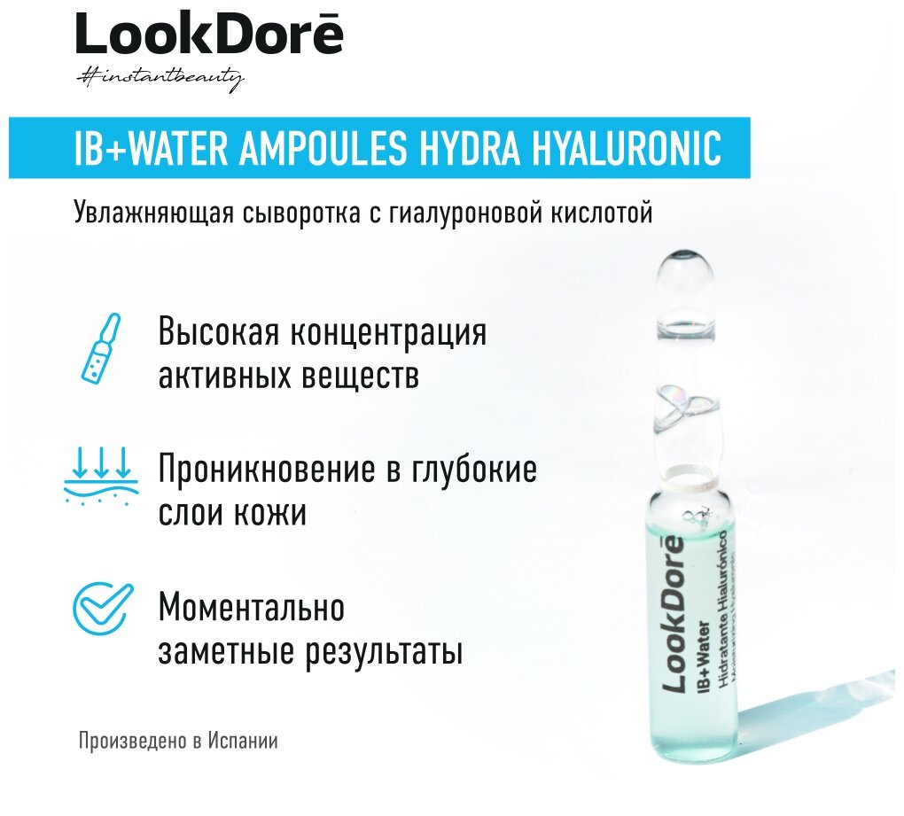 LookDore IB + Water Moisturizing Hyaluronic ampoules интенсивно увлажняющая сыворотка содержит максимальное количество активных ингредиентов в одной ампуле, чтобы оптимизировать запасы воды в коже, обеспечивая мгновенное её увлажнение.