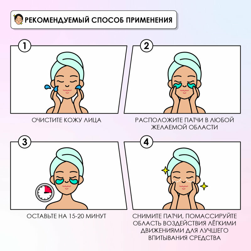 Расположите патчи в любой зоне лица, где требуется разгладить морщины, убрать отеки или мешки под глазами, оставьте на 15-20 минут. Подходит для ежедневного применения, для всех типов кожи.