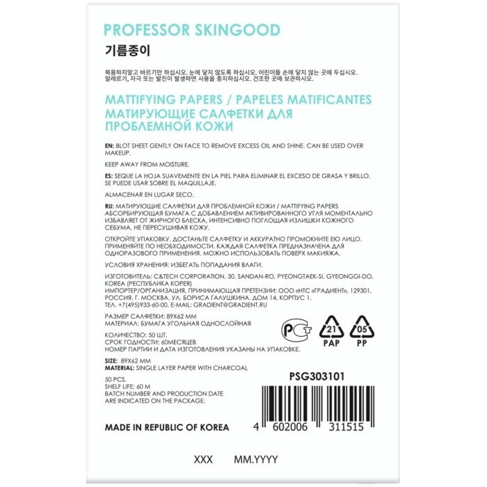 | Полное наименование | Professor SkinGOOD Матирующие салфетки для проблемной кожи Mattifying Papers, 50шт |