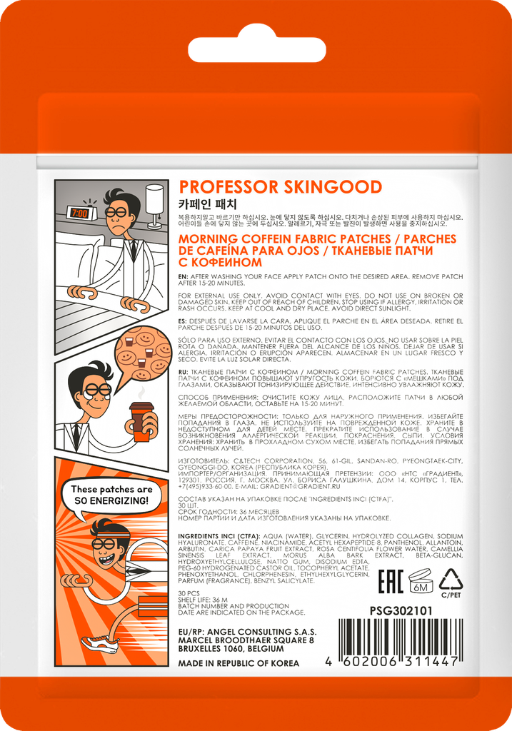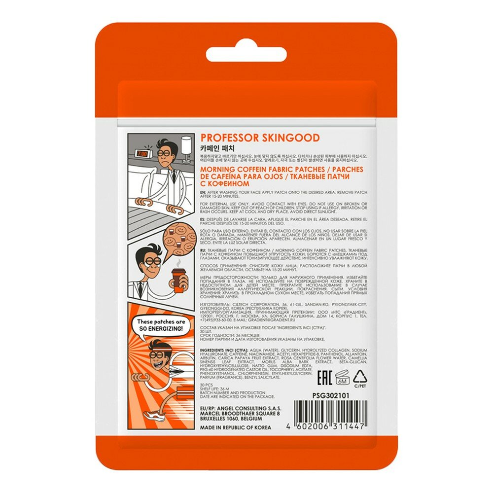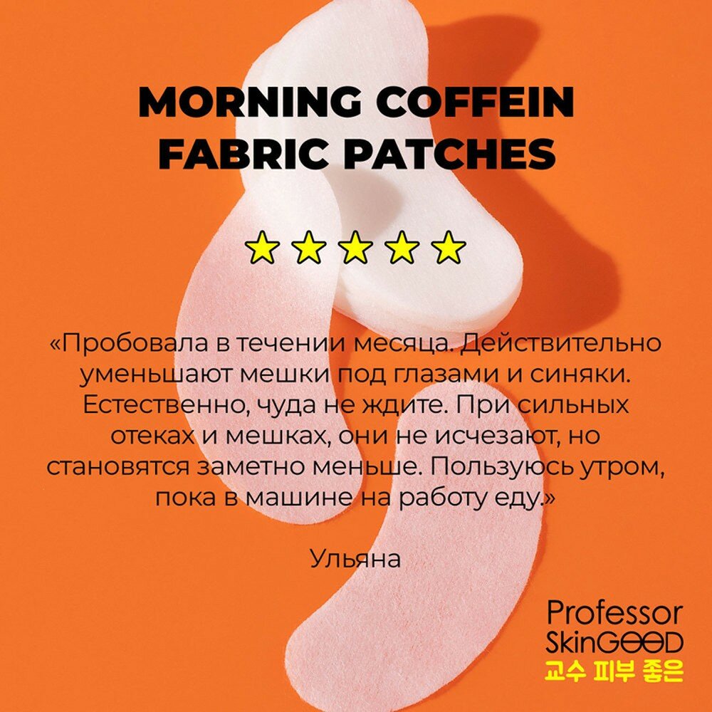 Патчи под глаза Morning Coffein Fabric Patches от Professor SkinGOOD (Профессор Скингуд) можно клеить на любую часть лица - носогубную зону, лоб, щеки, под глаза и подбородок. Упаковка zip-lock удобна при путешествии, а также предотвращает преждевременное высыхание патчей.