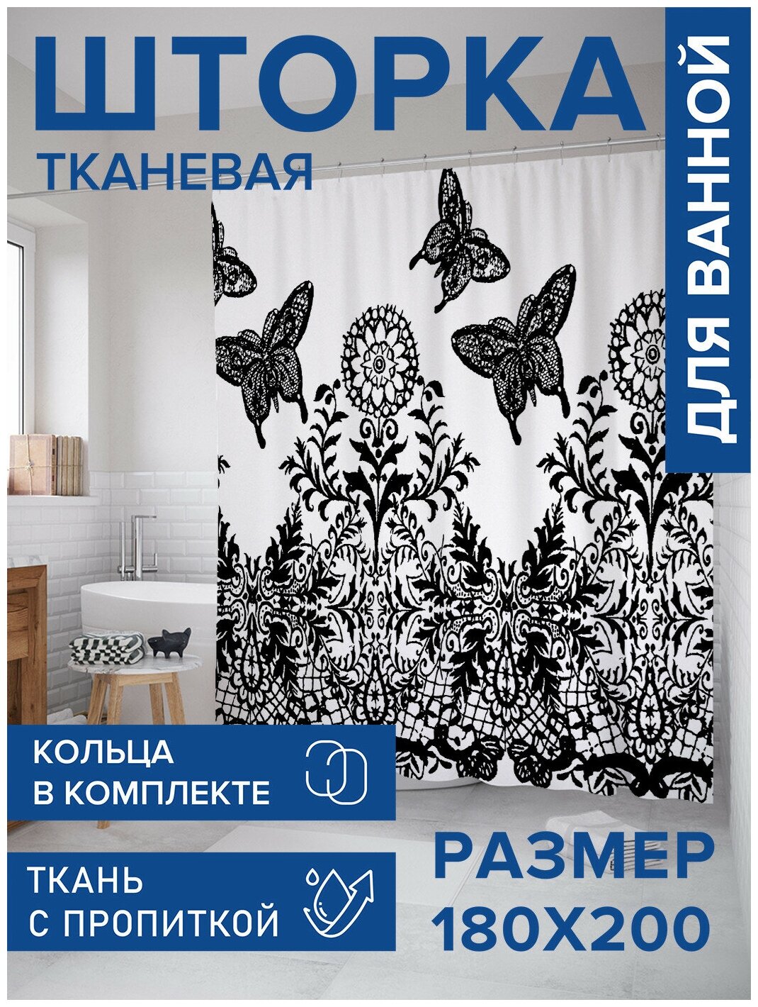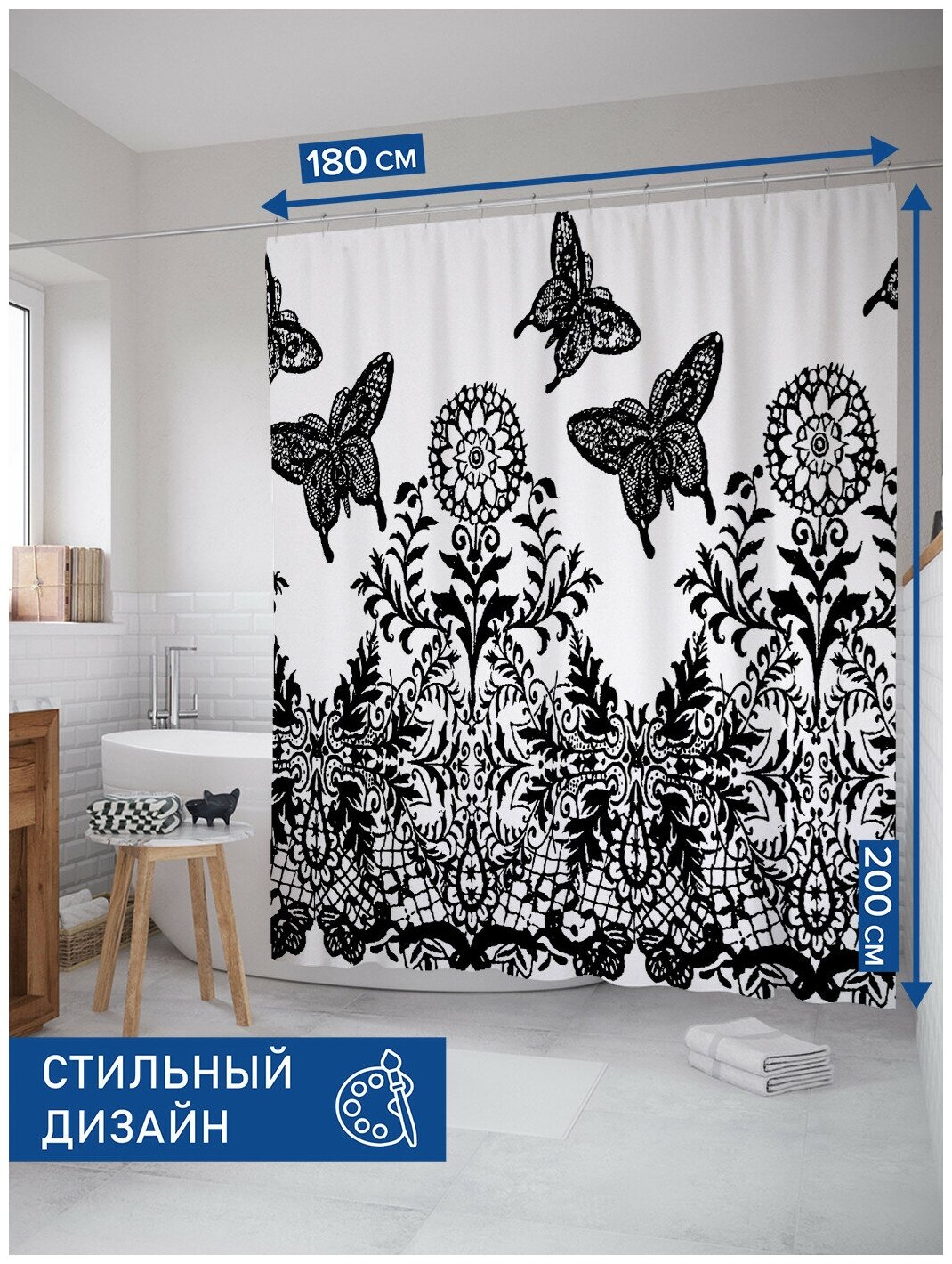 Красиво декорированная шторка, защищающая пол и оборудование ванной комнаты от брызг воды, изготовлена из полиэстера и обладает выраженными водоотталкивающими свойствами. Занавеска для ванной 180х200 комплектуется 12 прочными крючками из пластика и имеет в верхней части столько же обработанных на оверлоке отверстий. Декоративный рисунок нанесен на поверхность ткани при помощи фотопечати. Такие принты не боятся влаги и не смываются даже очень горячей водой.