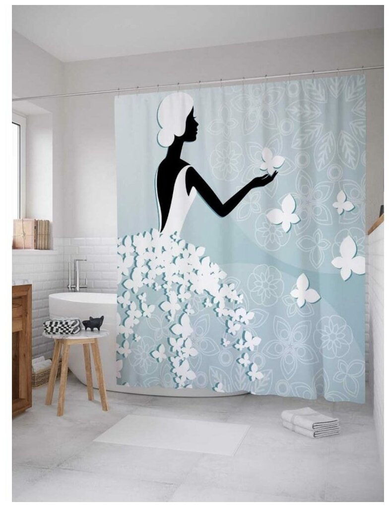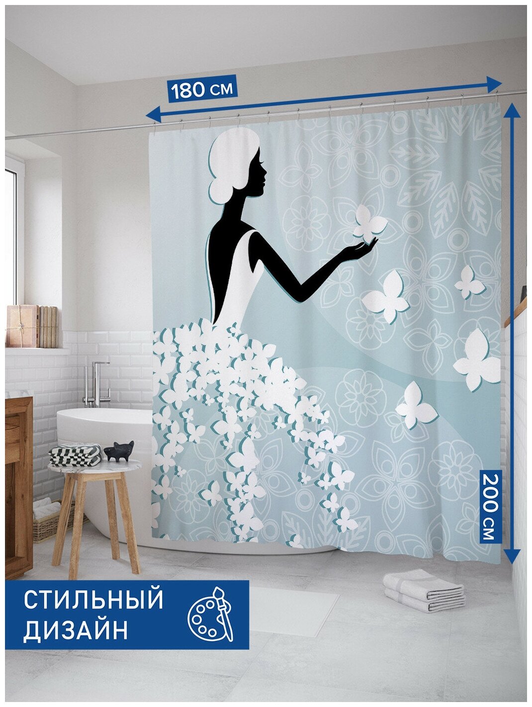 Штора (занавеска) для ванной «Девушка в платье из бабочек» из ткани 180х200 см с крючками JoyArty Штора для ванной Девушка в платье из бабочек 180х200 см