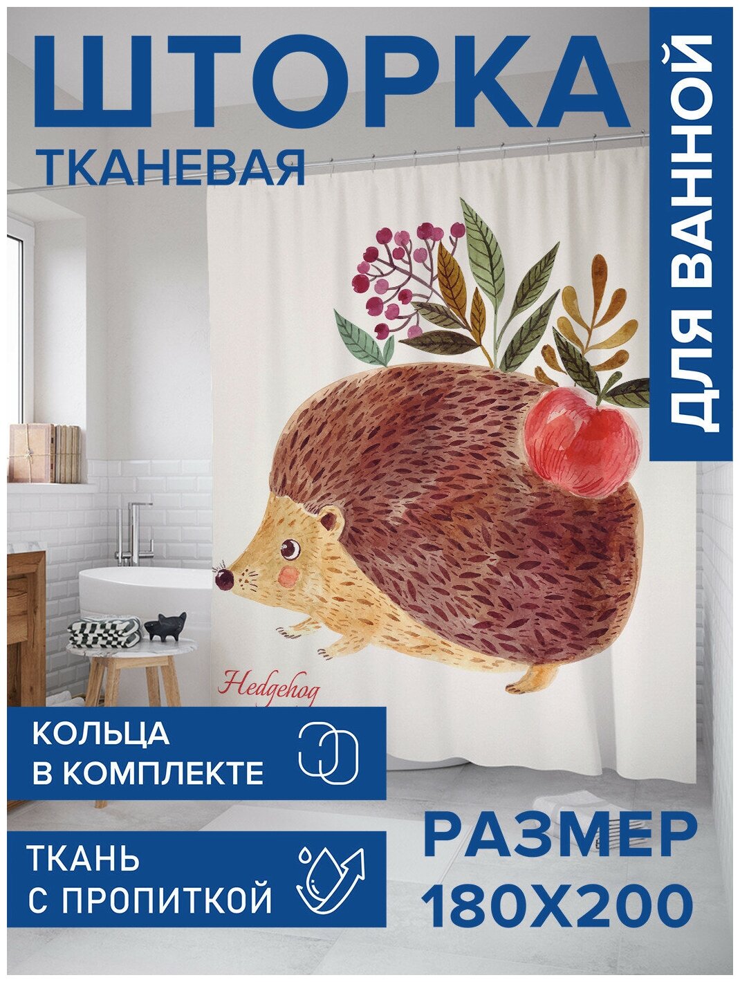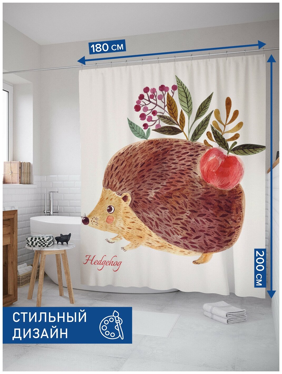 Шторка-занавеска для ванной JOYARTY Штора для ванной Ежик с яблоком 180х200 см