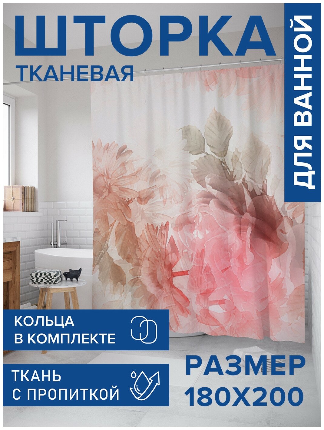 Красиво декорированная шторка, защищающая пол и оборудование ванной комнаты от брызг воды, изготовлена из полиэстера и обладает выраженными водоотталкивающими свойствами. Занавеска для ванной 180х200 комплектуется 12 прочными крючками из пластика и имеет в верхней части столько же обработанных на оверлоке отверстий. Декоративный рисунок нанесен на поверхность ткани при помощи фотопечати. Такие принты не боятся влаги и не смываются даже очень горячей водой.