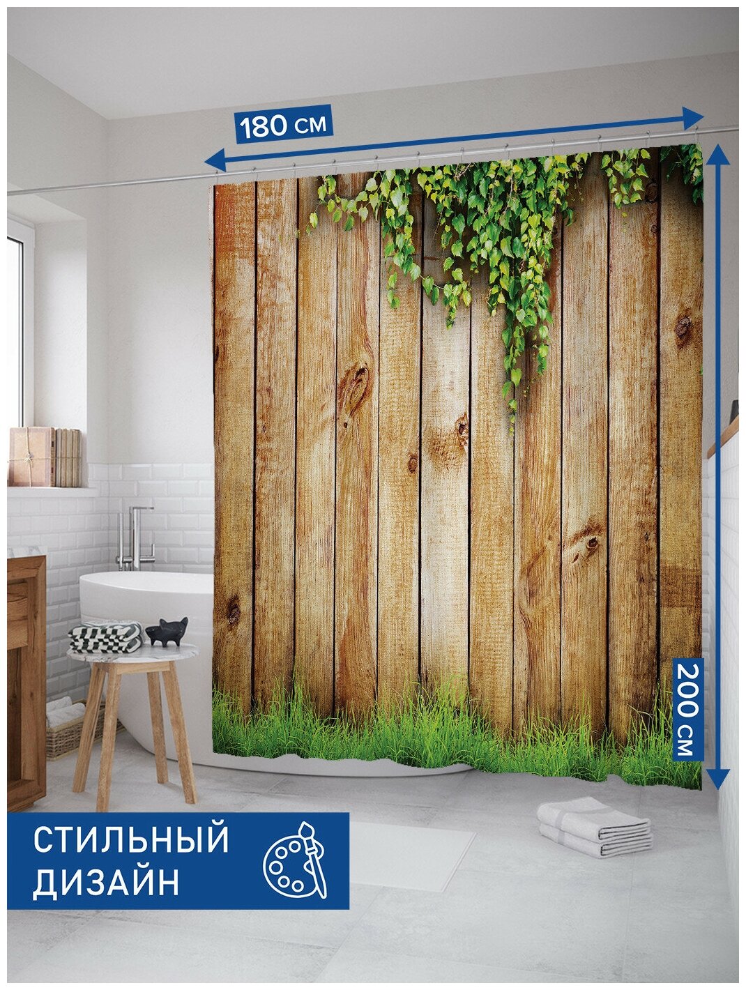 Красиво декорированная шторка, защищающая пол и оборудование ванной комнаты от брызг воды, изготовлена из полиэстера и обладает выраженными водоотталкивающими свойствами. Занавеска для ванной 180х200 комплектуется 12 прочными крючками из пластика и имеет в верхней части столько же обработанных на оверлоке отверстий. Декоративный рисунок нанесен на поверхность ткани при помощи фотопечати. Такие принты не боятся влаги и не смываются даже очень горячей водой.