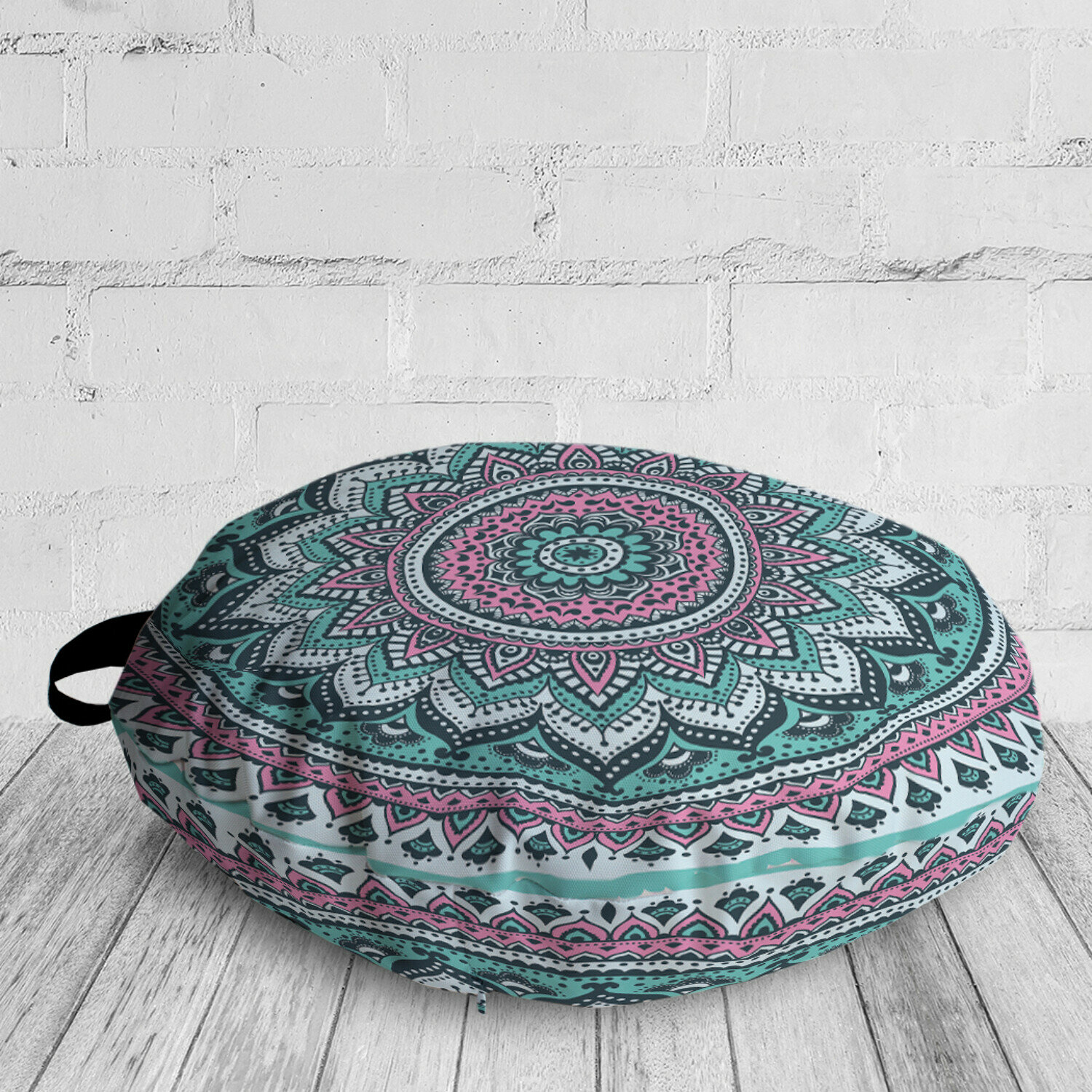 Наполненное полиуретановой крошкой изделие не впитывает влагу, так его чехол обработан безвредной водоотталкивающей пропиткой. Учитывая, что наполнитель помещен в дополнительную внутреннюю наволочку, декоративный чехол с принтами при необходимости удобно снимается для стирки. Бывает неудобно сидеть не только на полу, поэтому изделие можно использовать в качестве круглой подушки на табурет, деревянный стул или старое кресло.