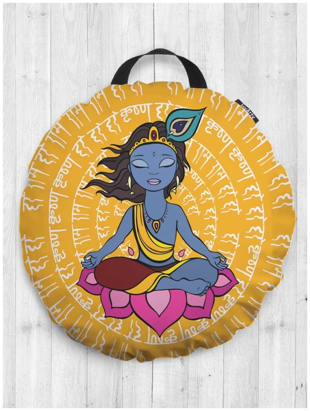 Наполненное полиуретановой крошкой изделие не впитывает влагу, так его чехол обработан безвредной водоотталкивающей пропиткой. Учитывая, что наполнитель помещен в дополнительную внутреннюю наволочку, декоративный чехол с принтами при необходимости удобно снимается для стирки. Бывает неудобно сидеть не только на полу, поэтому изделие можно использовать в качестве круглой подушки на табурет, деревянный стул или старое кресло.