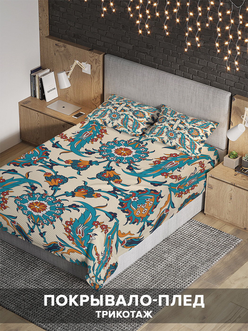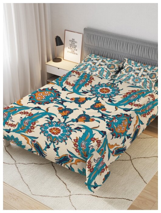 В отличие от обычных, выполненных из ткани жаккард покрывал Евро размера 220х235 см, предлагаемый комплект отличается эксклюзивным внешним видом и особой функциональностью. За счет комбинированной структуры, образованной двумя слоями плотной жаккардовой ткани и расположенным между ними утеплителем из синтепона, стеганое покрывало такого качества при необходимости может использоваться вместо пледа или легкого одеяла. Лицевая часть изделия и дополняющих комплект двух наволочек размером 50х70 см, кроме традиционного для жаккардовой основы узорчатого плетения нитей, украшена цветной декоративной фотопечатью. Внутренняя поверхность оставлена идеально белой. Покрывало с рисунком обладает гипоаллергенными свойствами, и без последствий для внешнего вида способно выдержать множество стирок.