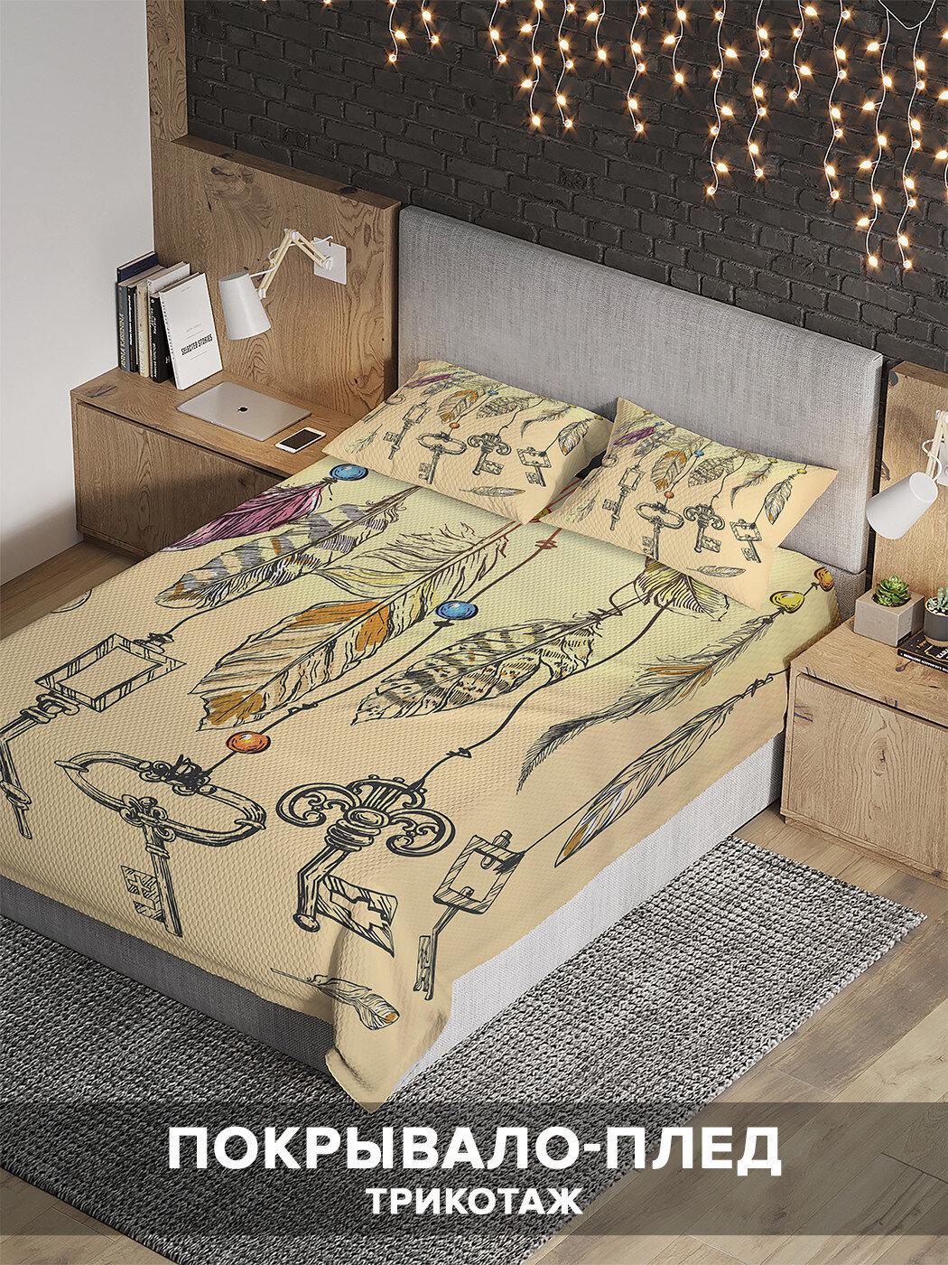 Модель: Покрывало стеганое Перья с ключами 235x220 и две наволочки 70х50