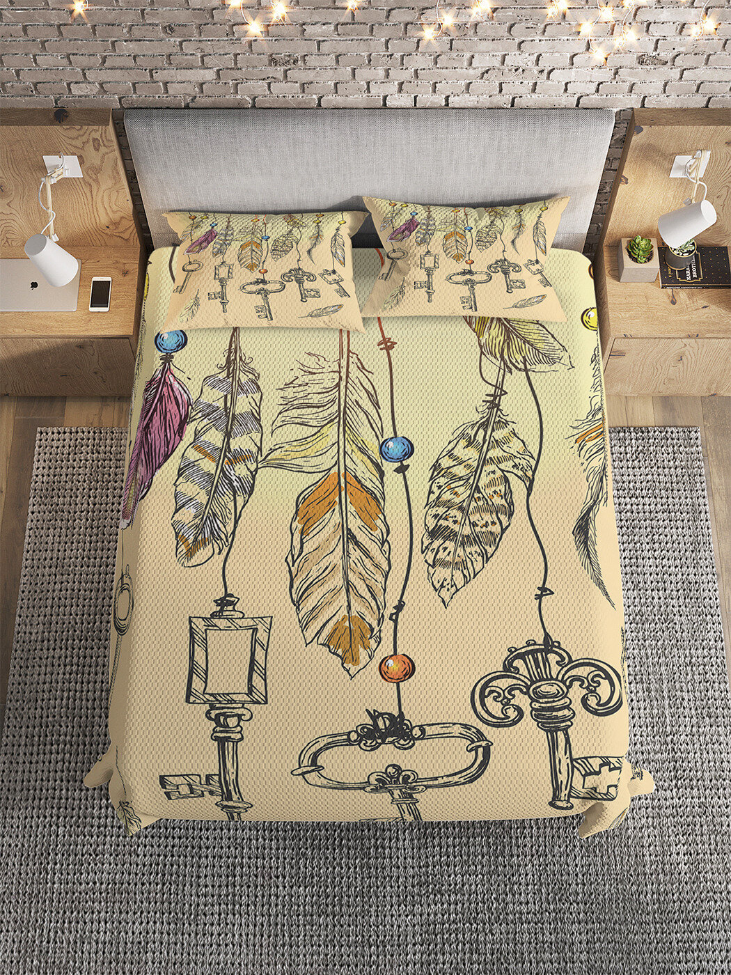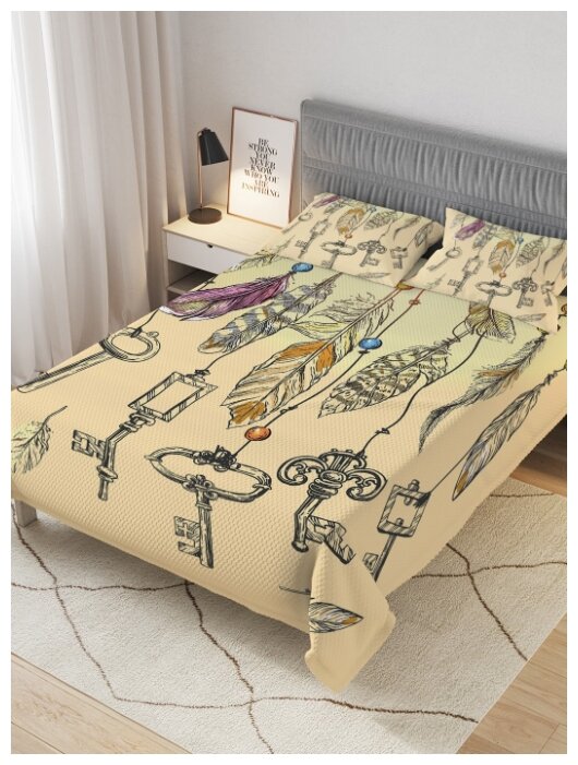 Покрывало Ambesonne 220х235 см с 2 наволочками 50x70 см Покрывало стеганое Перья с ключами 235x220 и две наволочки 70х50 (размер: евростандарт)
