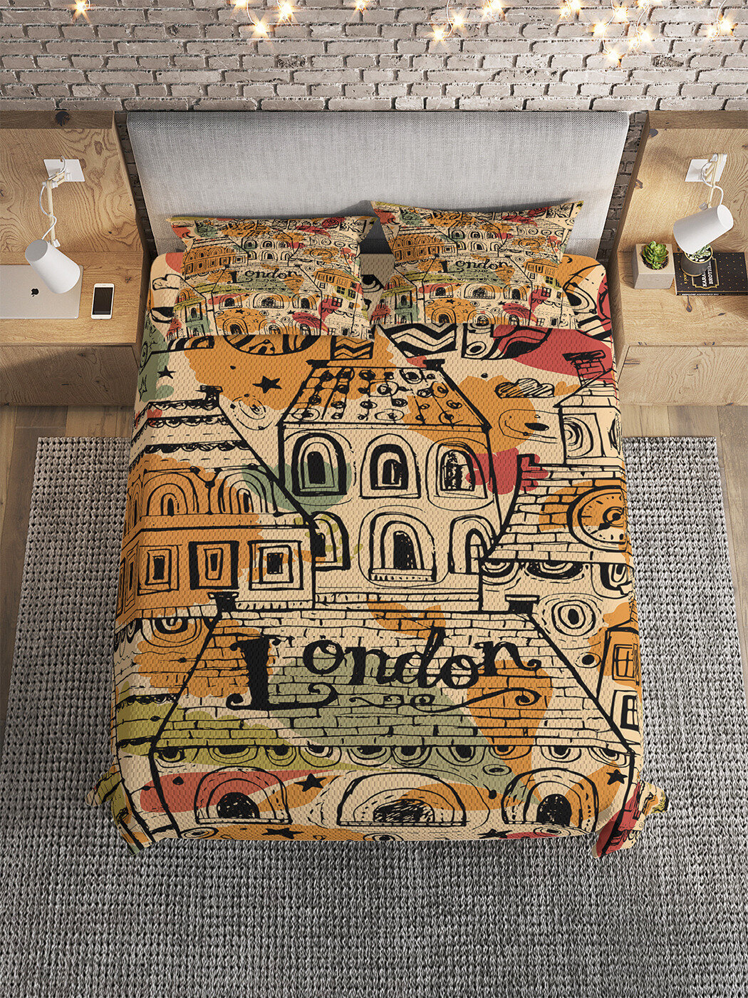 Покрывало Ambesonne 160х220 см с 2 наволочками 50x70 см Покрывало стеганое Лондонский район 220х160 и две наволочки 70х50 (размер: 1.5-спальный)