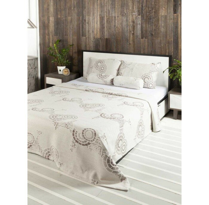 В отличие от обычных, выполненных из ткани жаккард покрывал Евро размера 160x220 см, предлагаемый комплект отличается эксклюзивным внешним видом и особой функциональностью. За счет комбинированной структуры, образованной двумя слоями плотной жаккардовой ткани и расположенным между ними утеплителем из синтепона, стеганое покрывало такого качества при необходимости может использоваться вместо пледа или легкого одеяла. Лицевая часть изделия и дополняющих комплект двух наволочек размером 50х70 см, кроме традиционного для жаккардовой основы узорчатого плетения нитей, украшена цветной декоративной фотопечатью. Внутренняя поверхность оставлена идеально белой. Покрывало с рисунком обладает гипоаллергенными свойствами, и без последствий для внешнего вида способно выдержать множество стирок.