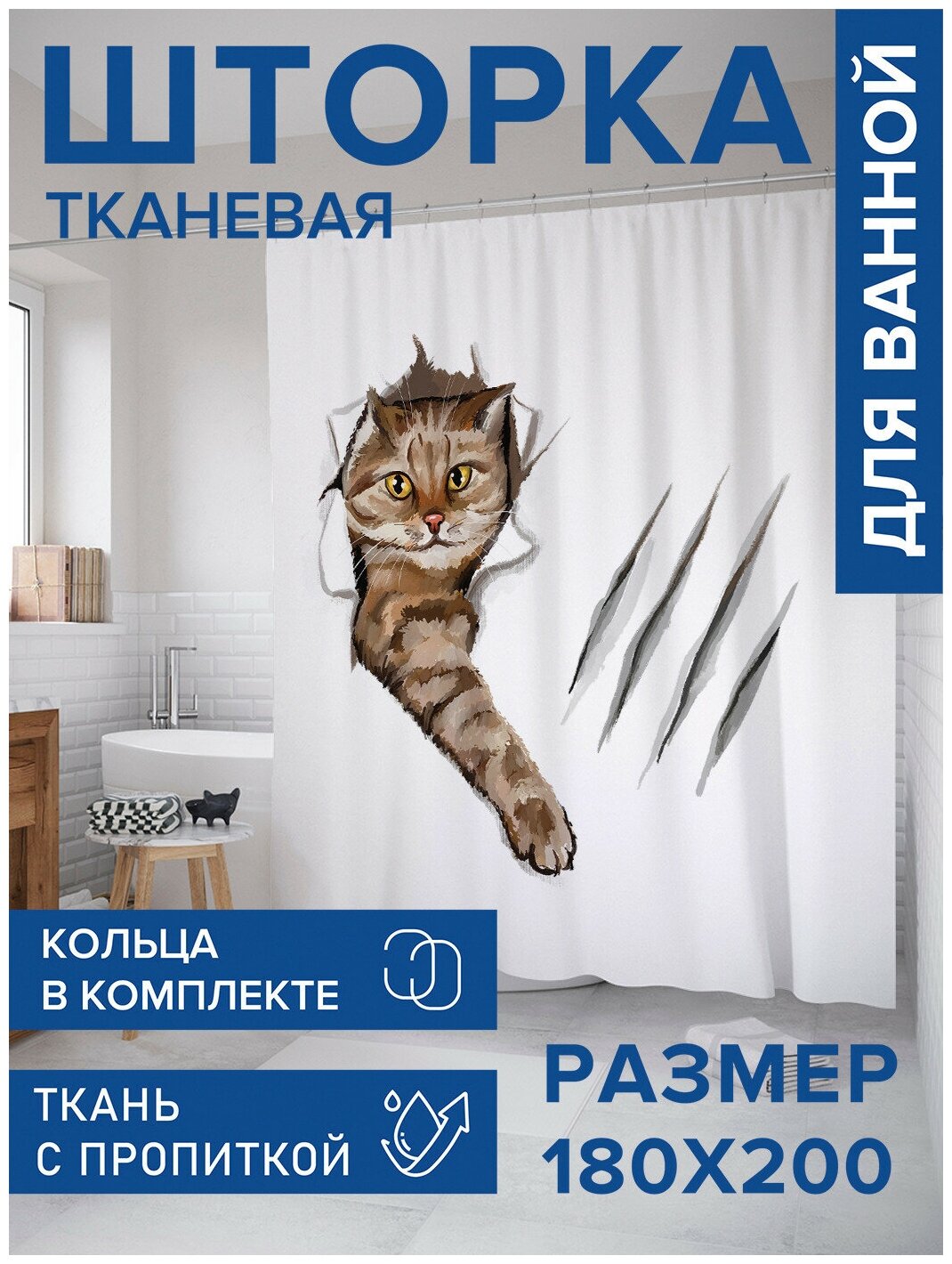 Шторка-занавеска для ванной JOYARTY Штора занавеска из сатена с крючками Озорной кот 200х180 см (размер: 180х200)