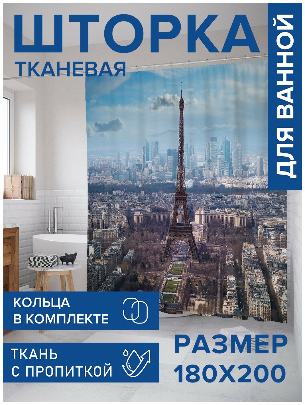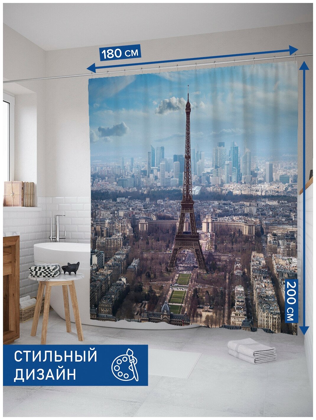 Шторка-занавеска для ванной JOYARTY Штора занавеска из сатена с крючками Величие эйфелевой башни 200х180 см (размер: 180х200)