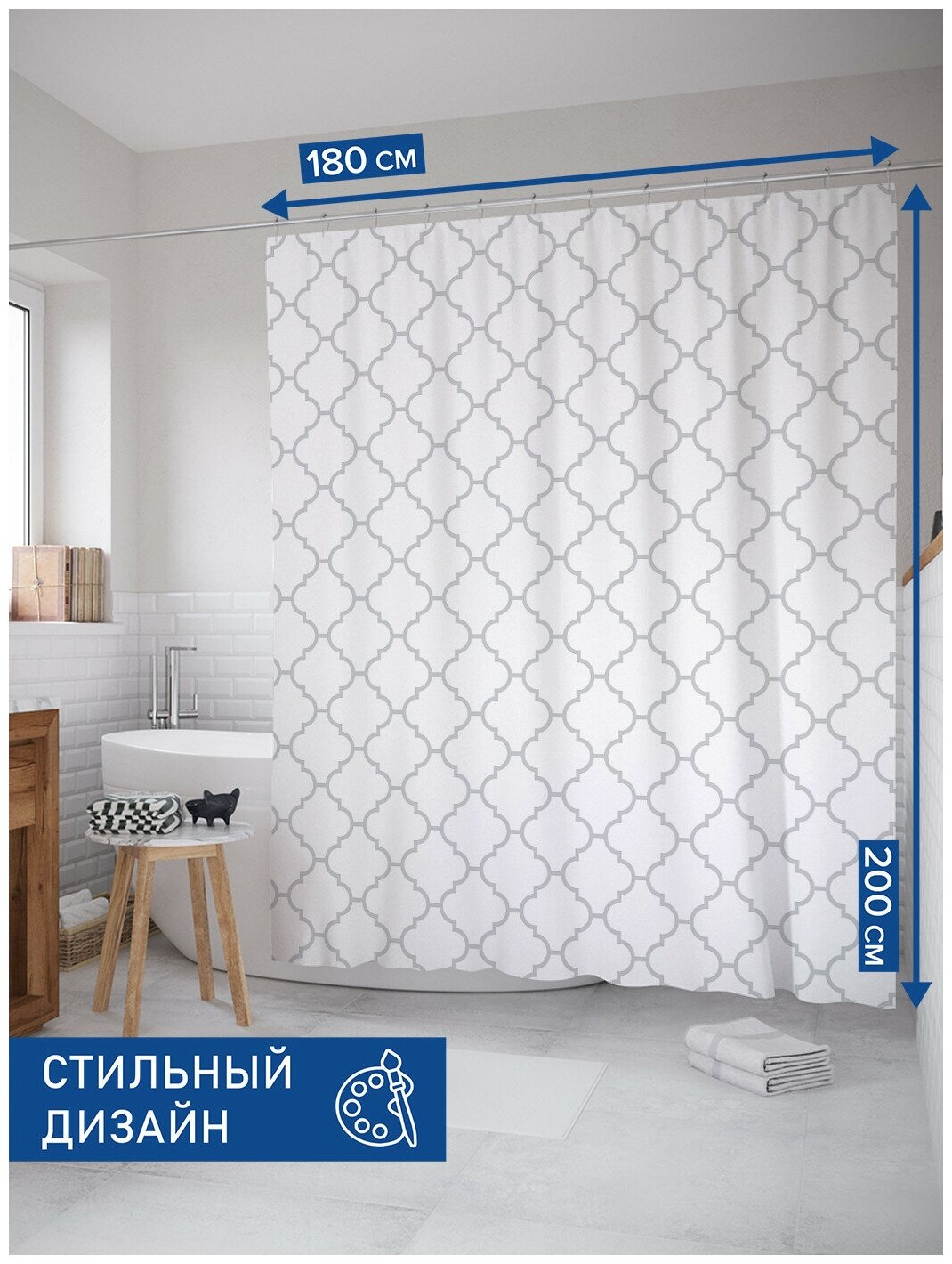 Красиво декорированная шторка, защищающая пол и оборудование ванной комнаты от брызг воды, изготовлена из полиэстера и обладает выраженными водоотталкивающими свойствами.