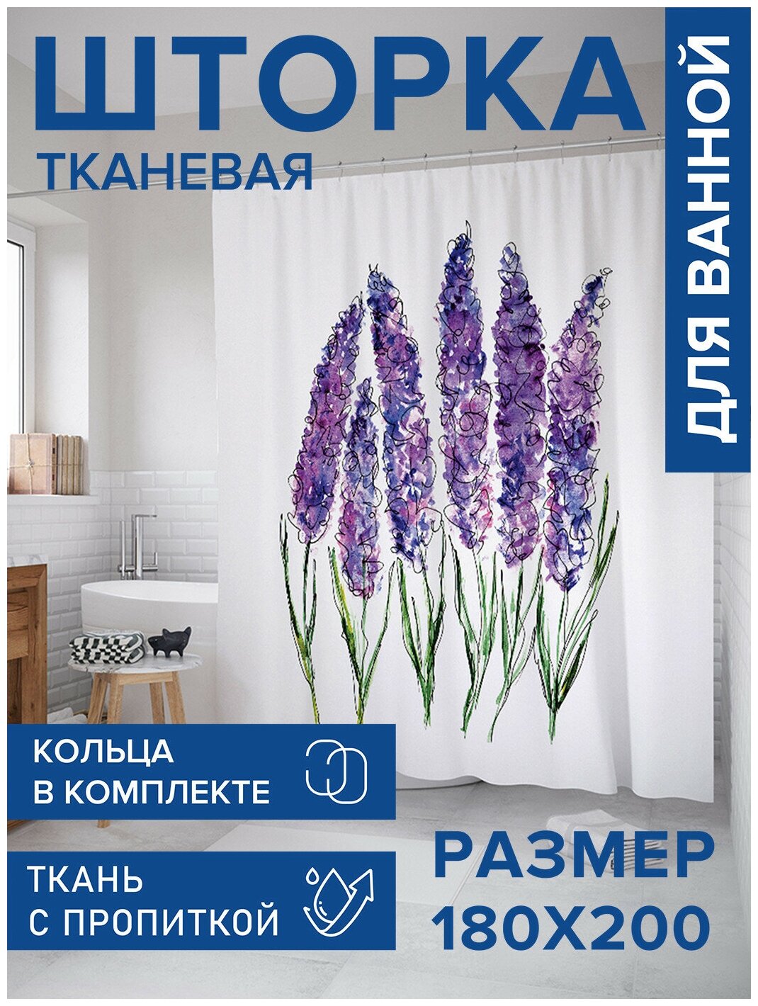 Красиво декорированная шторка, защищающая пол и оборудование ванной комнаты от брызг воды, изготовлена из полиэстера и обладает выраженными водоотталкивающими свойствами.