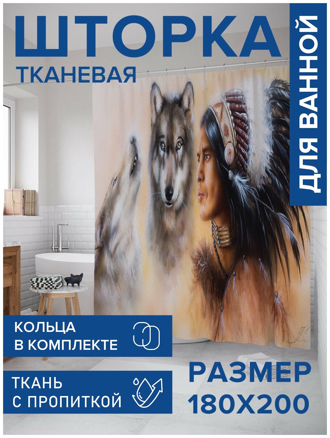 Шторка-занавеска для ванной JOYARTY Штора занавеска из сатена с крючками Индеец с волками 200х180 см (размер: 180х200)