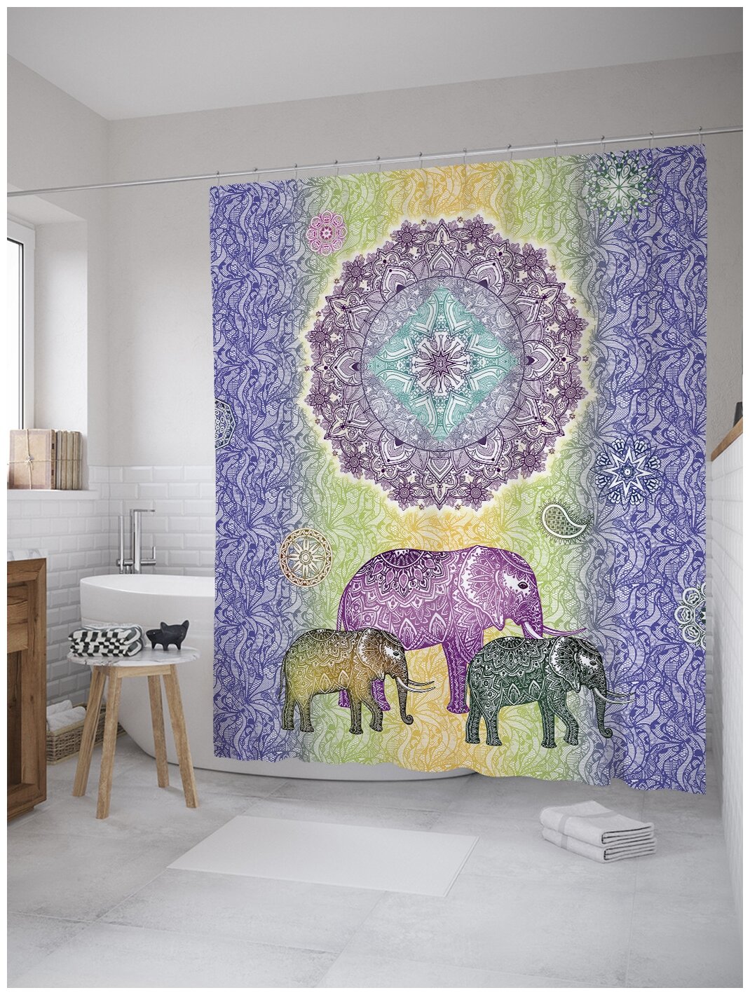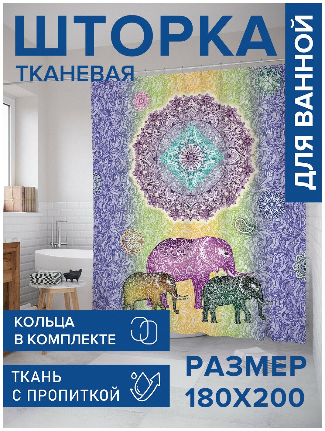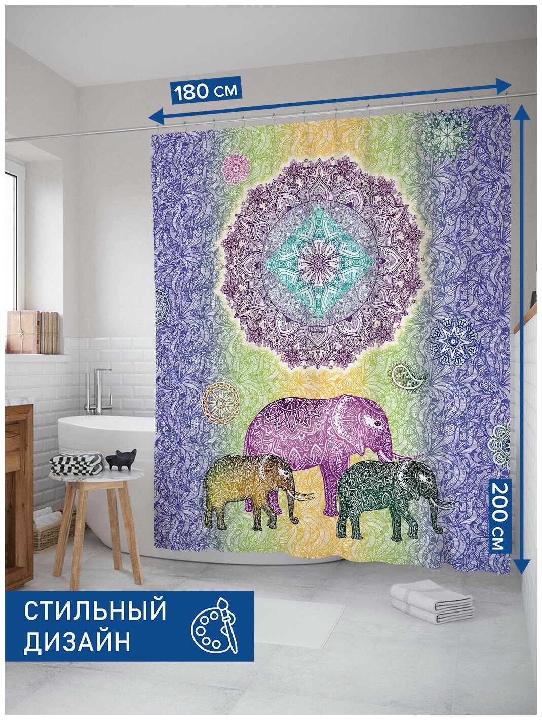 Сервис сравнения цен СкидкаГИД предлагает сравнить цены на товар «Штора для ванной JoyArty "Идущие украшенные слоны" из сатена 180х200 см с крючками Штора занавеска из сатена с крючками Идущие украшенные слоны 200х180 см»