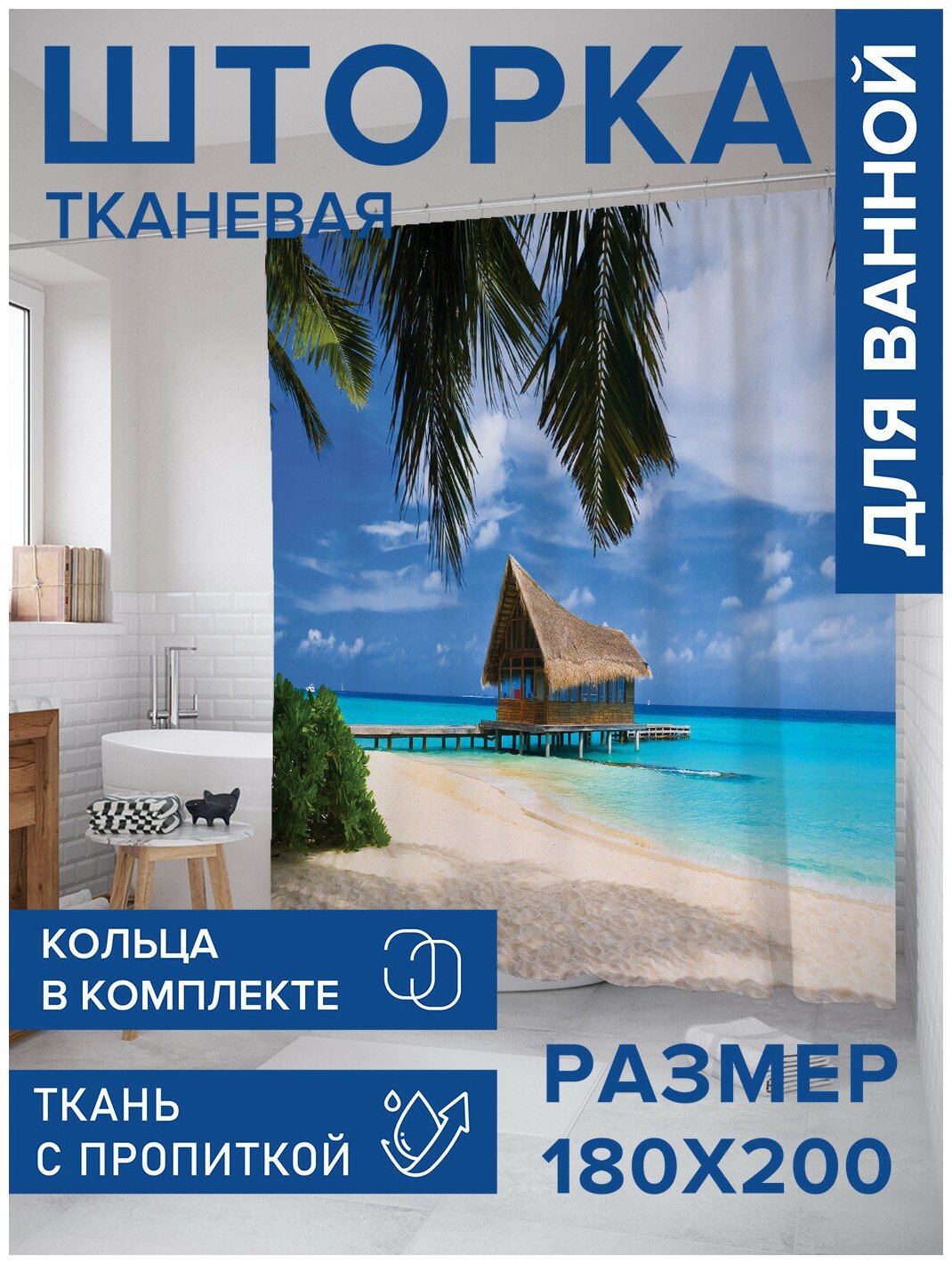 Шторка-занавеска для ванной JOYARTY Штора занавеска из сатена с крючками Домик на пляже 200х180 см (размер: 180х200)
