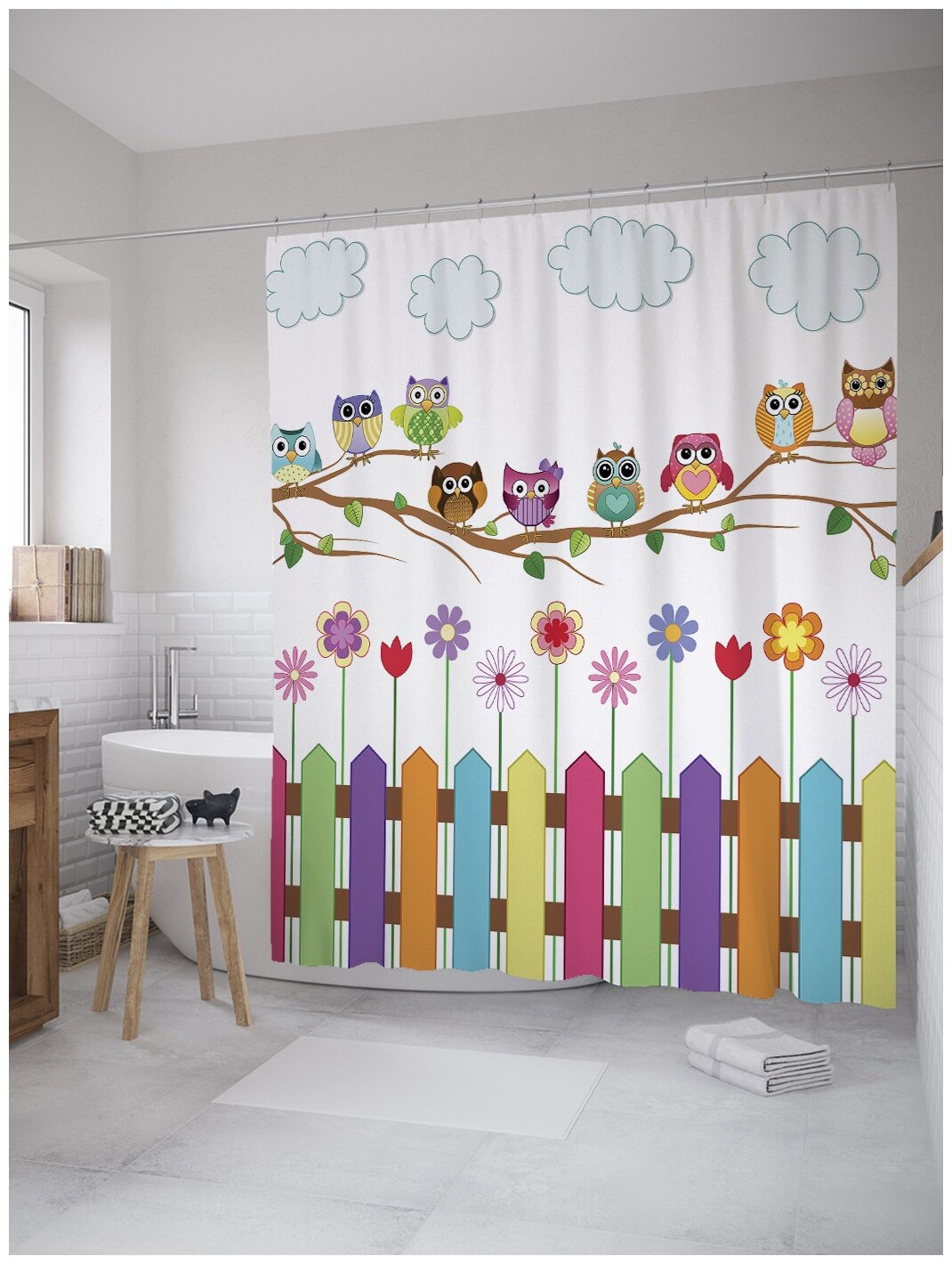 Сервис сравнения цен СкидкаГИД предлагает сравнить цены на товар «Шторка-занавеска для ванной JOYARTY Штора занавеска из сатена с крючками Веселые совы 200х180 см (размер: 180х200)»