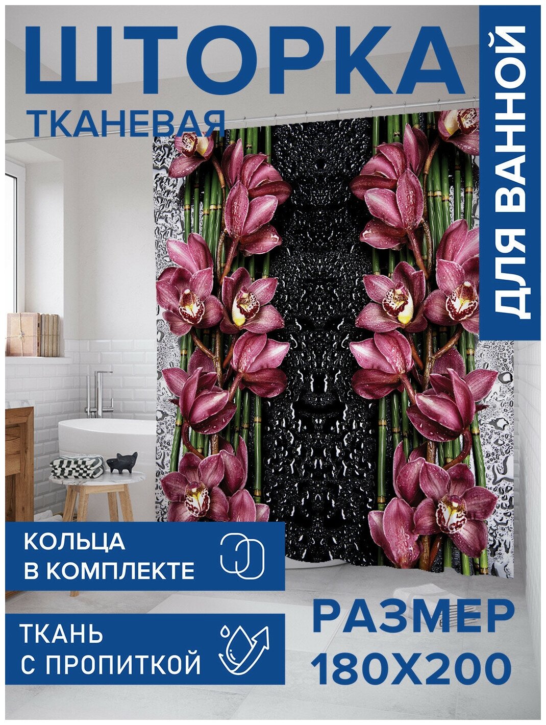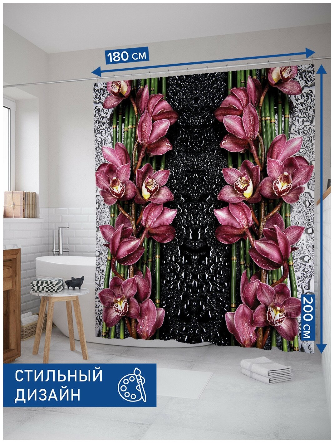 Шторка-занавеска для ванной JOYARTY Штора занавеска из сатена с крючками Цветы в каплях дождя 200х180 см (размер: 180х200)
