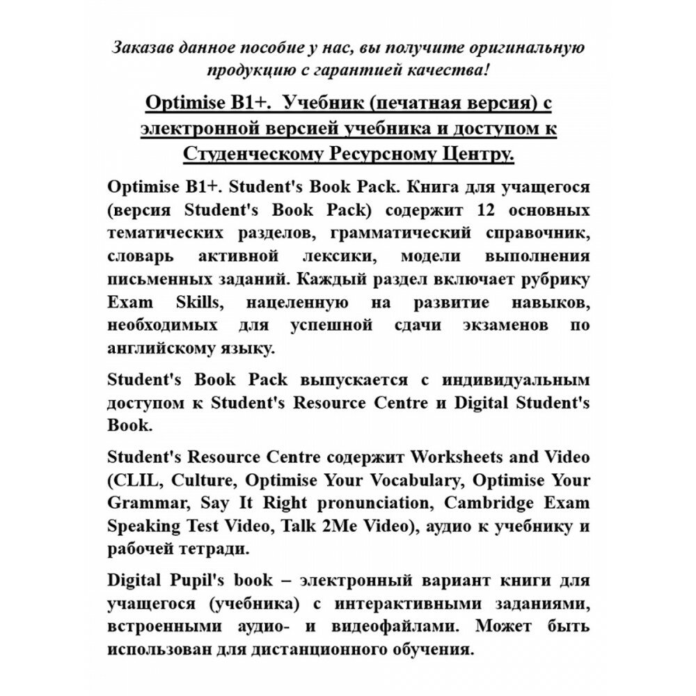 Optimise - это курс подготовки к экзаменам для подростков. В нем представлены увлекательные занятия, дающие ученикам необходимые навыки и техники для обеспечения успешного прохождения экзамена.