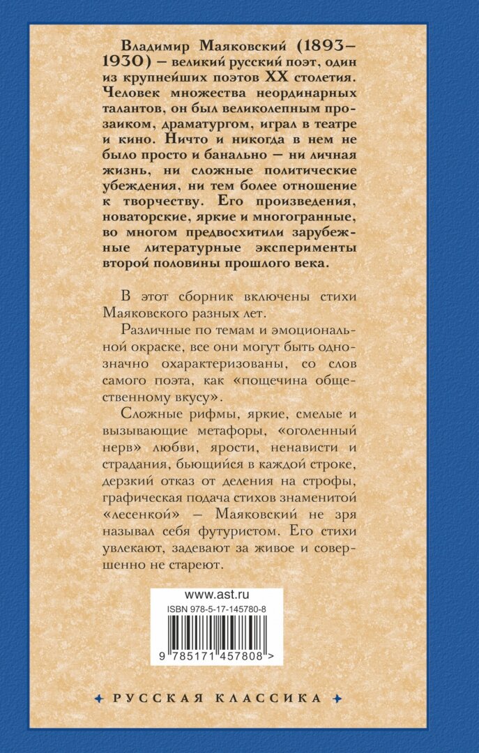 Сборник стихов Маяковского. Чего тут больше скажешь. Тут и знаменитая его графическая подача стихов лесенкой, сложные рифмы, яркие метафоры... Для начала двадцатого века все это "пощечина общественному вкусу". Сегодня все это наивно. По моему мнению, Маяк устарел и вне контекста своего времени во многом не понятен в наши дни. Конечно, стихотворений это касается в меньшей степени, но для их понимания надо быть знакомым с биографией автора, историей того периода, в том числе, с историей повседневности. Издание в твердом переплете и для своей цены очень даже неплохое.