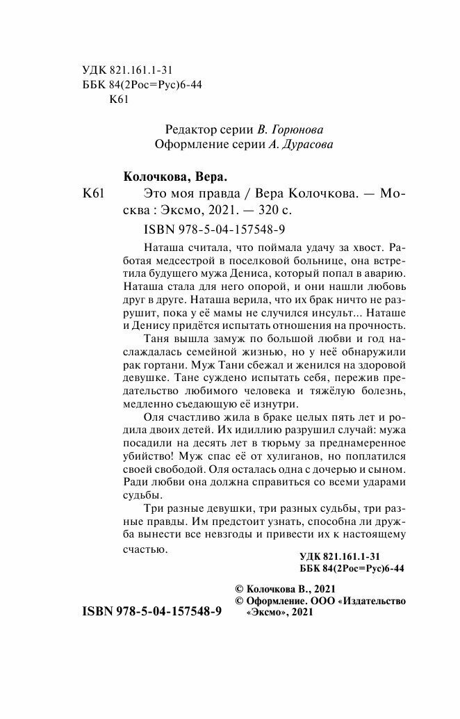 Книги Веры Колочковой - это не обычный сентиментальный роман,где сюжет развивается по стреотипно-избитому плану. Каждая ее книга - это история из жизни,не киношной,а той,которая рядом. Ее героини нам близки и понятны,они живут рядом. И эта книга не стала исключением. Три женщины, три истории,три судьбы и три правды. Каждая из них живёт так,как велит ее правда. Кто-то осуждает, кто-то поддерживает,но не свернуть с пути, значит, остаться в мире с самой собой.