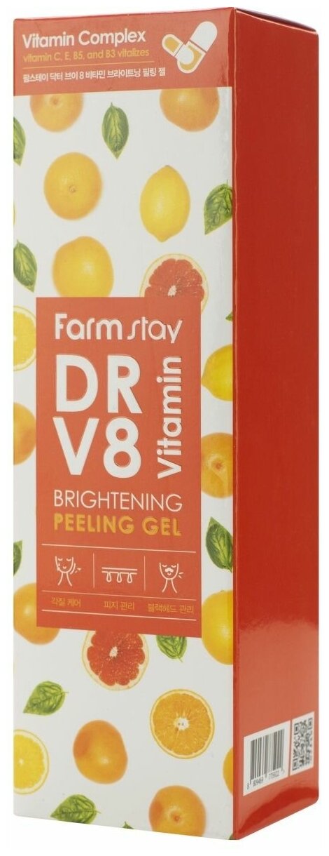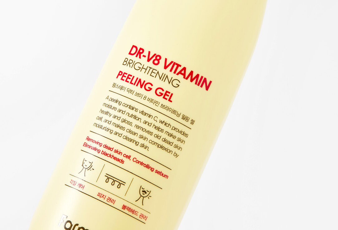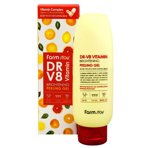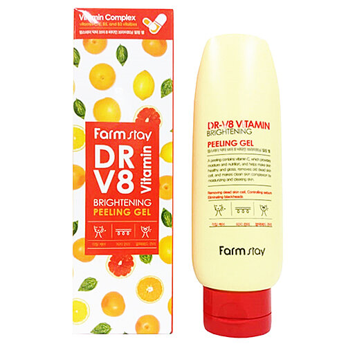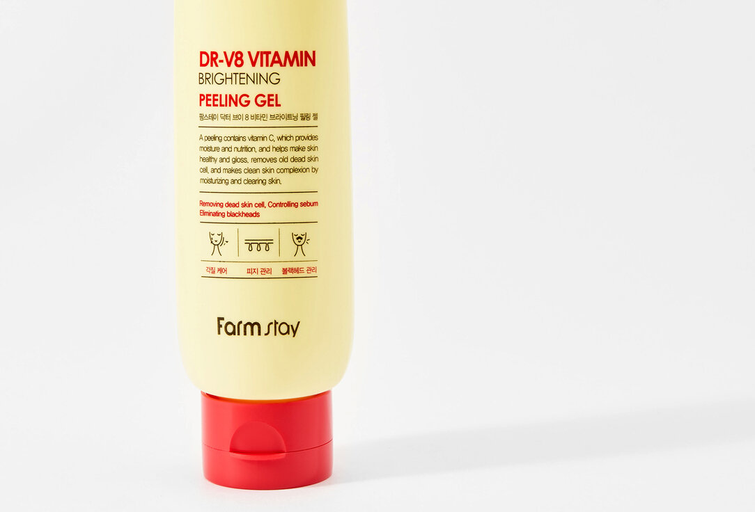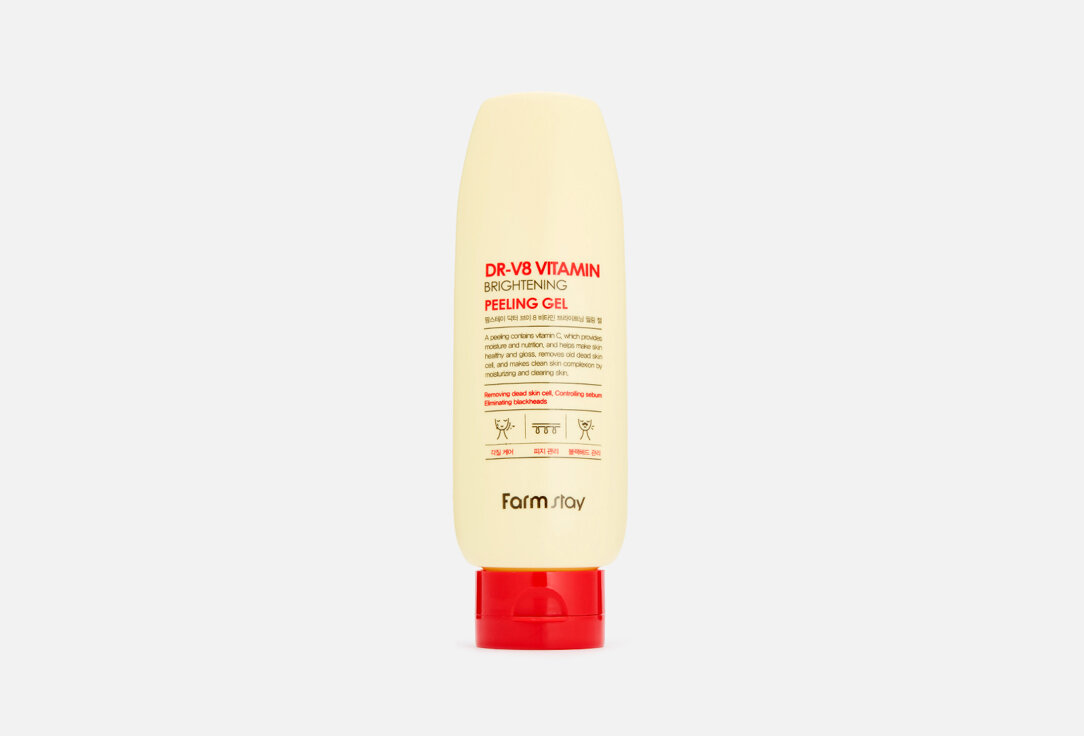 Отшелушивающий гель FarmStay Dr-V8 Vitamin Brightening Peeling Gel с комплексом витаминов эффективно устраняет шелушения кожи, очищает кожи от загрязнений, излишков кожного жира и ороговевших клеток эпидермиса.