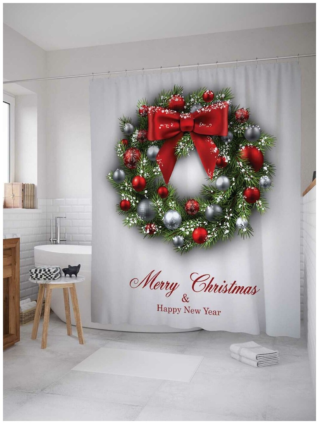 Шторка-занавеска для ванной JOYARTY Штора для ванной Новогодний венок 180х200 см
