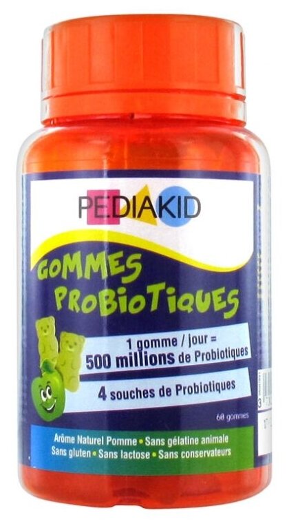 Добавка к пище в виде жевательных мишек-мармеладок на основе кисломолочных ферментов, тщательно отобранных и сбалансированных.Педиакид Жевательный мармелад-пробиотик / Pediakid Gommes Probiotiques был специально разработан для восстановления и поддержания баланса микрофлоры кишечника детей с помощью содержащихся в нем активных ингредиентов: Lactobacillus casei, Lactobacillus acidophilus, Lactobacillus plantarum, Streptococcus thermophilus: кисломолочные ферменты тщательно отобраны и сбалансированы для оптимального восстановления кишечной микрофлоры. Одна жевательная пастилка содержит 500 млн пробиотиков. Идеальная стабильность пробиотиков обеспечивается благодаря специальной обработке. Не содержит желатин, без консервантов, без глютена, без лактозы, без искусственных вкусовых добавок и красителей.1 жевательная мармеладка / день = 500 миллионов пробиотиков.4 штамма пробиотиков.Помогает поддерживать микрофлору кишечника.PEDIAKID Gommes Probiotiques / Жевательный мармелад-пробиотик разработан на основе яблочного пектина. Не содержит желатин, без консервантов, без глютена, без лактозы, без искусственных вкусовых добавок и красителей.Противопоказания: индивидуальная непереносимость компонентов.Перед применением рекомендуется консультация с врачом-педиатром.