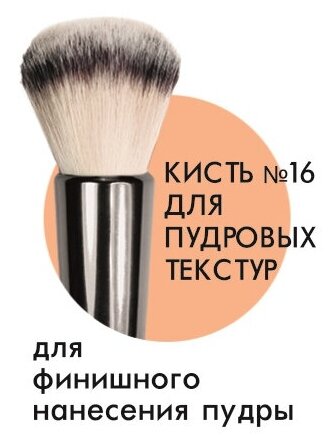 При помощи кисти №16 теперь возможно сделать профессиональный макияж прямо у себя дома. Ее мягкий ворс наносит пудру тончайшим слоем и отлично фиксирует макияж. Ворсинки округлой формы расположены плотно друг к другу, что позволяет наносить пудру и другие компактные продукты невероятно легко и равномерно. Достаточно сделать несколько взмахов для того, чтобы лицо покрыла незримая вуаль, способная сделать вас еще более привлекательной!