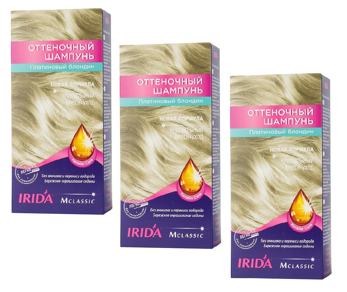Оттеночный шампунь IRIDA-М (Ирида) Платиновый, создан для тех, кто планирует менять цвет своих волос и экспериментировать с образом и фантазировать с внешностью. Действия оттеночного шампуня хватает на месяц, после этого можно вновь менять свой цвет волос. Данный шампунь отлично подходит для обновления и выравнивания цвета в перерывах между покраской аммиачными красками.Оттеночный шампунь Ирида-М нежно окрашивает Ваши волосы в нужный цвет, хорошо справляется с седыми волосками. В одной упаковке шампуня укомплектовано 3 пакетика с краской. На одну покраску тратится один-два пакетика с краской (в зависимости от длины волос), а третий применить чтобы подкрашивать отросшие корни. Шампунь, как и краску нужно нанести на волосы, оставить минут на 30, после смыть проточной водой. Краска легко смывается с лица и шеи, если она во время окрашивания попадет на тело.В результате окрашивания, волосы получают красивый натуральный блеск и легкий оттенок. Этим шампунем рекомендовано окрашивать волосы, если вы не планируете радикально менять цвет своих волос, а хотите лишь слегка сформиров