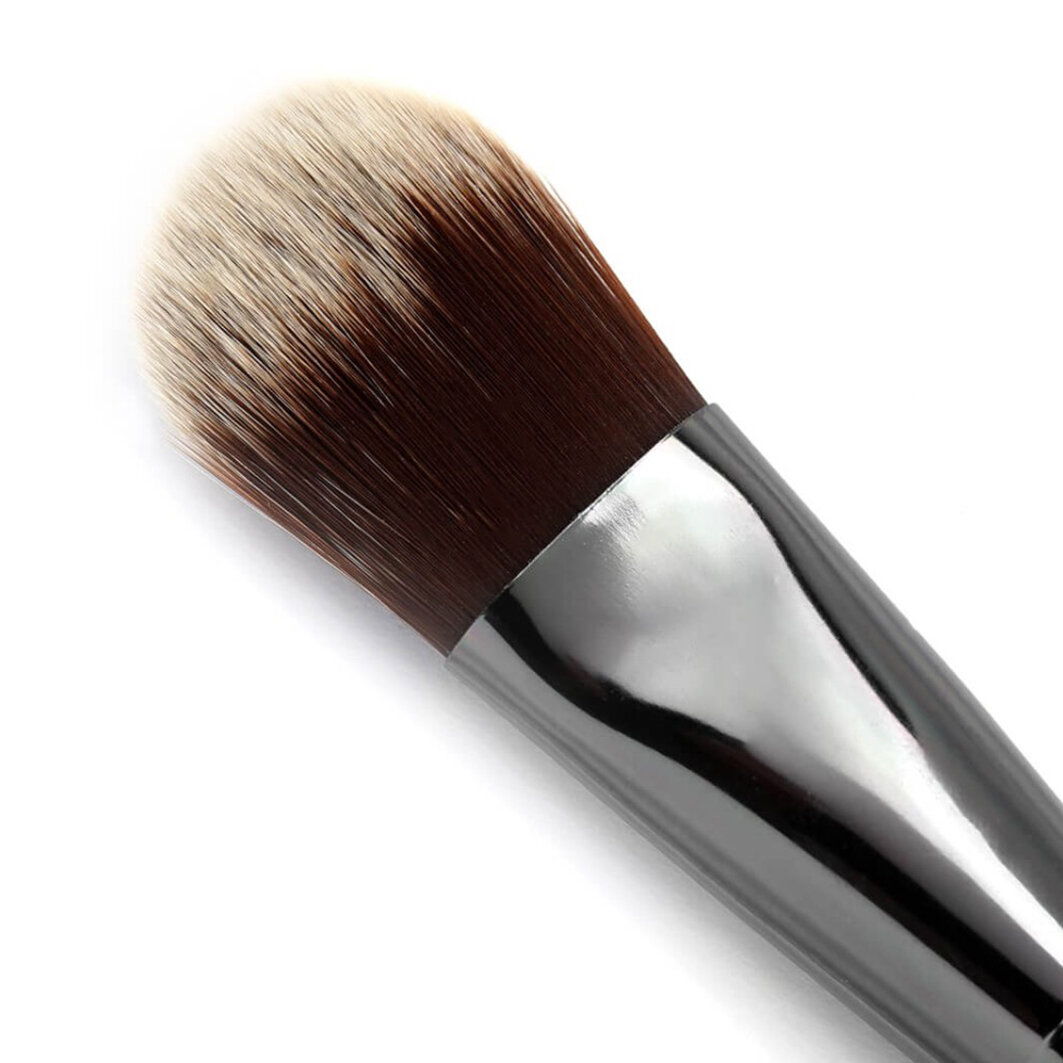 Классическая плоская кисть куполообразной формы с длинной мягкой щетиной для нанесения жидких тональных текстур на лицо, шею, область декольте, а также на область вокруг глаз и носа.