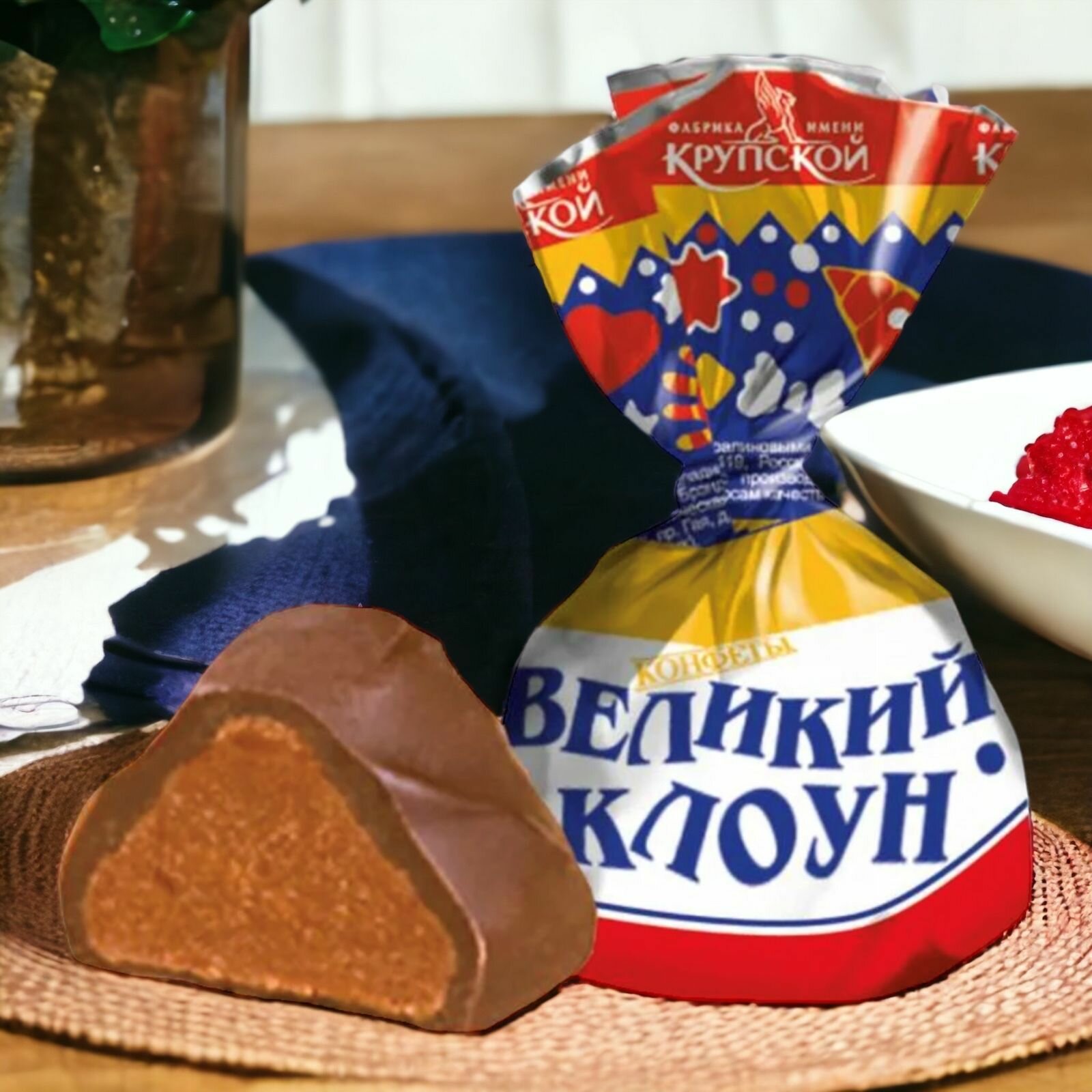 Конфеты куполообразной формы с шоколадной глазурью "Великий клоун" с корпусами типа пралине. В составе конфет только натуральные ингредиенты Начинка: молочно-шоколадная с добавлением тертого кешью и миндаля. Такие конфеты можно поставить на стол как в будний день, так и в выходные или праздники. Они отлично подходят и для домашнего чаепития, и для того, чтобы угостить коллег в офисе.