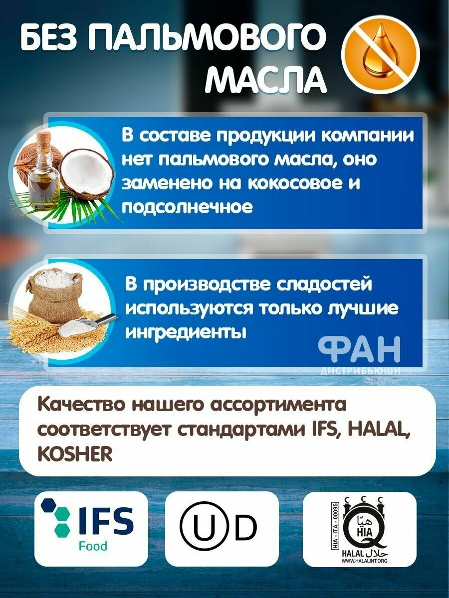 | Состав | Пшеничная мука, кокосовое масло, сахар, сироп глюкозы, сухая молочная сыворотка, эмульгаторы |