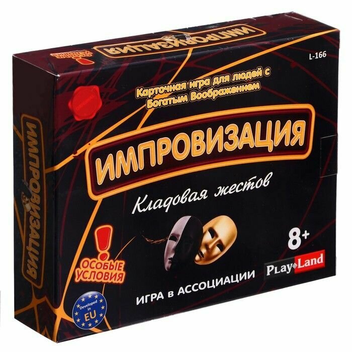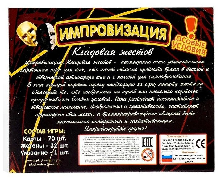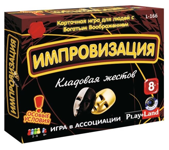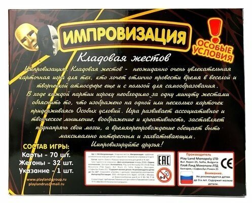 «Импровизация» - игра в воображение для детей старше 5 лет и взрослых. В игре могут участвовать от 2 до 6 игроков. Цель игроков - жестами объяснить другим участникам определенные изображения в течении одной минуты, получая за это очки. Игра помогает развить свою фантазию, способности творческого мышления и артистичность! Комплектность: 70 карт с картинками на каждой, 30 жетонов с вариантами исполнения.