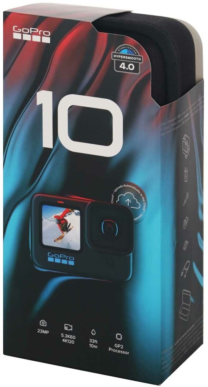 Невероятная производительность и удобство использования — представляем самую функциональную камеру GoPro в истории. Камера HERO10 Black, оснащенная новым процессором GP2, позволяет создавать видео 5.3K с удвоенной частотой кадров, фото 23 Мп, а также обеспечивает улучшенное качество съемки при слабом освещении и впечатляющую стабилизацию видео HyperSmooth 4.0 во всех режимах. Кроме того, HERO10 поддерживает подключение к облаку — сразу после подключения к зарядке ваши материалы автоматически выгружаются в облако.