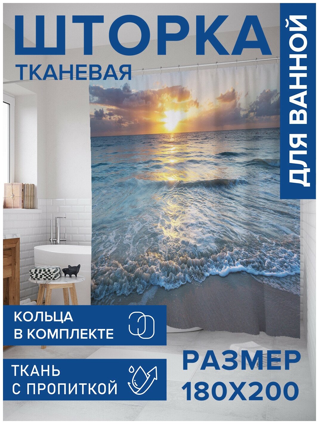 Шторка-занавеска для ванной JOYARTY Штора-занавеска для ванной из сатена с крючками Игривое море 200х180 см (размер: 180х200)