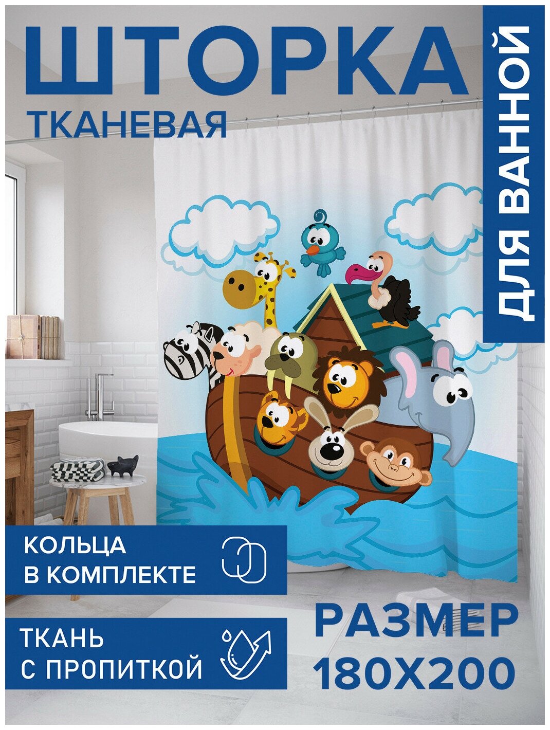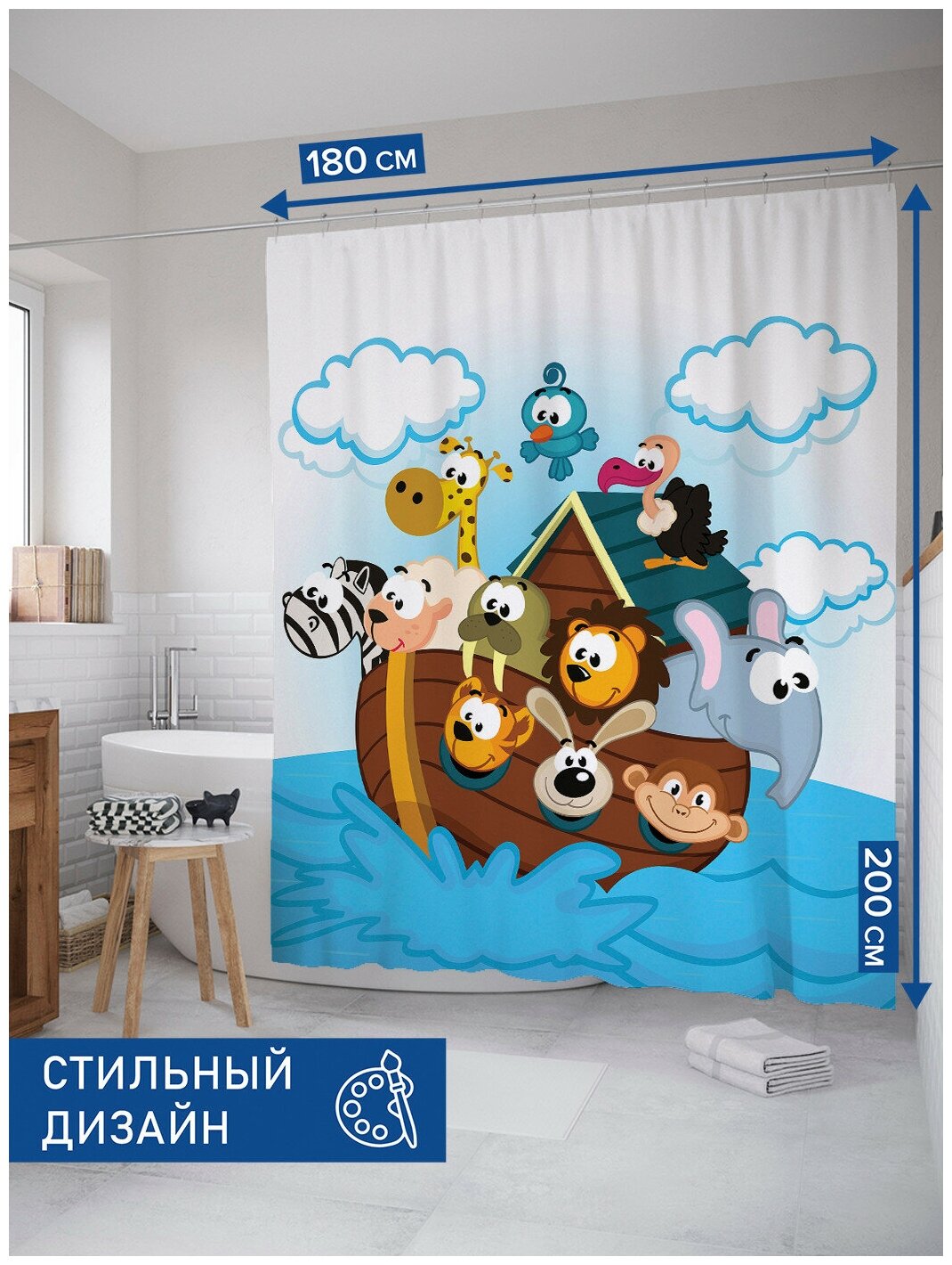 Шторка-занавеска для ванной JOYARTY Штора-занавеска для ванной из сатена с крючками Счастливый ковчег 200х180 см (размер: 180х200)