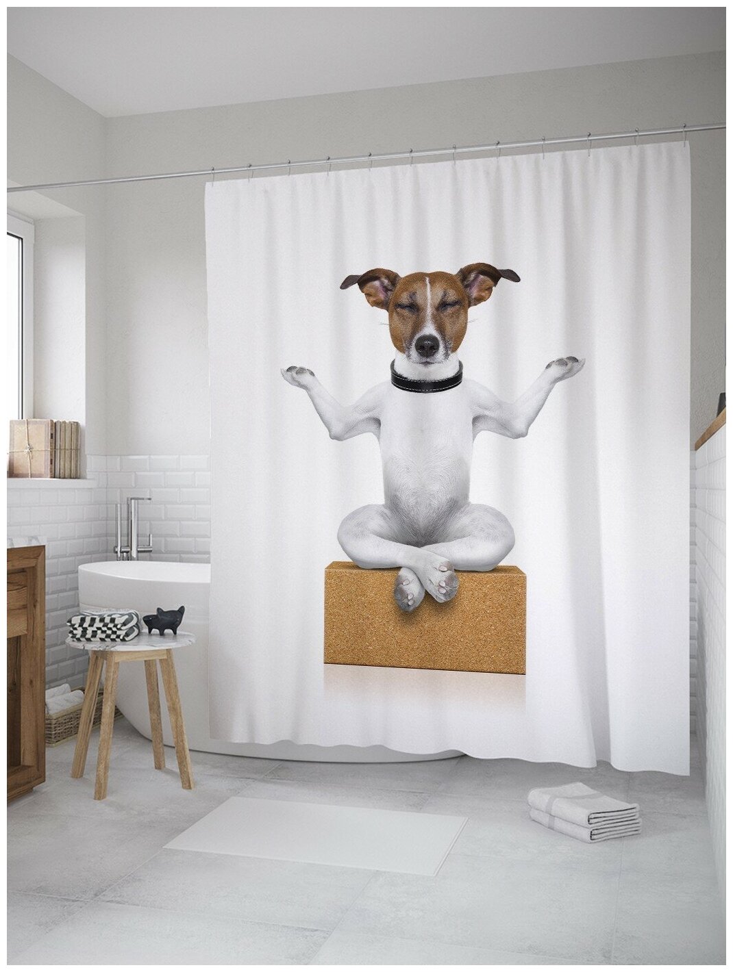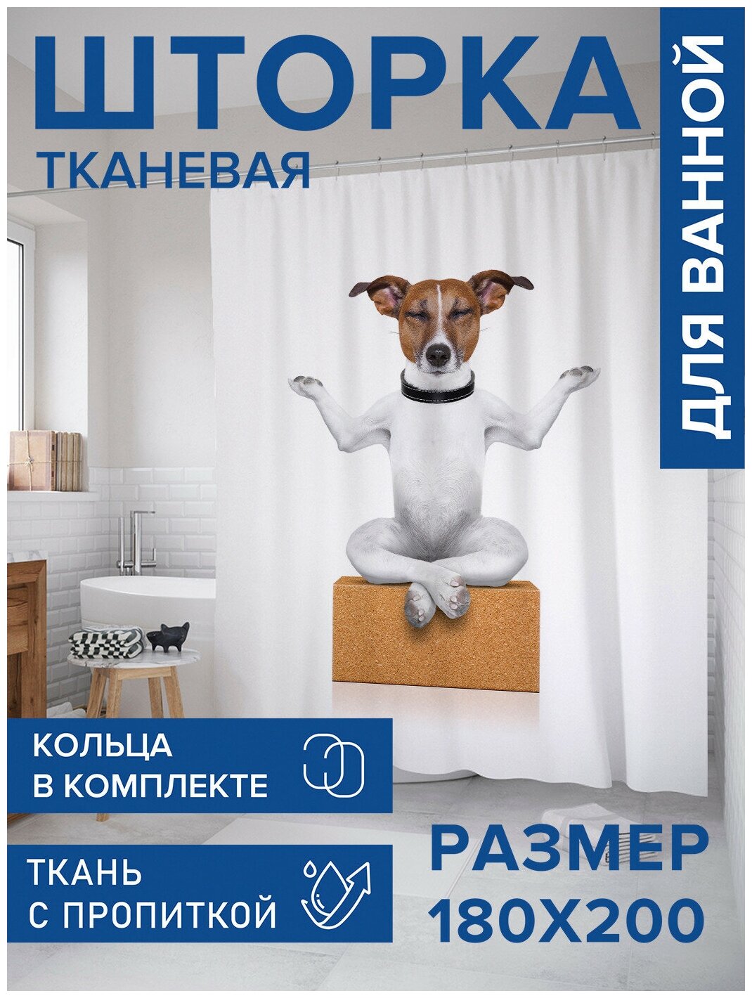Модель: Штора-занавеска для ванной из сатена с крючками Медитирующий пес 200х180 см