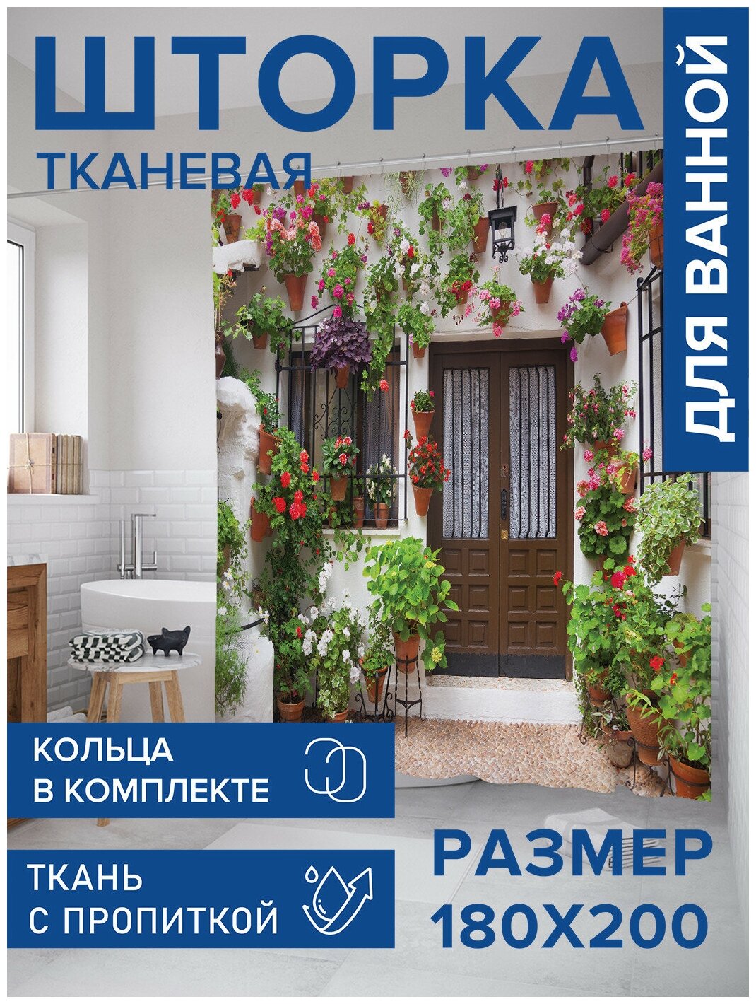Красиво декорированная шторка, защищающая пол и оборудование ванной комнаты от брызг воды, изготовлена из полиэстера и обладает выраженными водоотталкивающими свойствами. Занавеска для ванной 180х200 комплектуется 12 прочными крючками из пластика и имеет в верхней части столько же обработанных на оверлоке отверстий. Декоративный рисунок нанесен на поверхность ткани при помощи фотопечати.