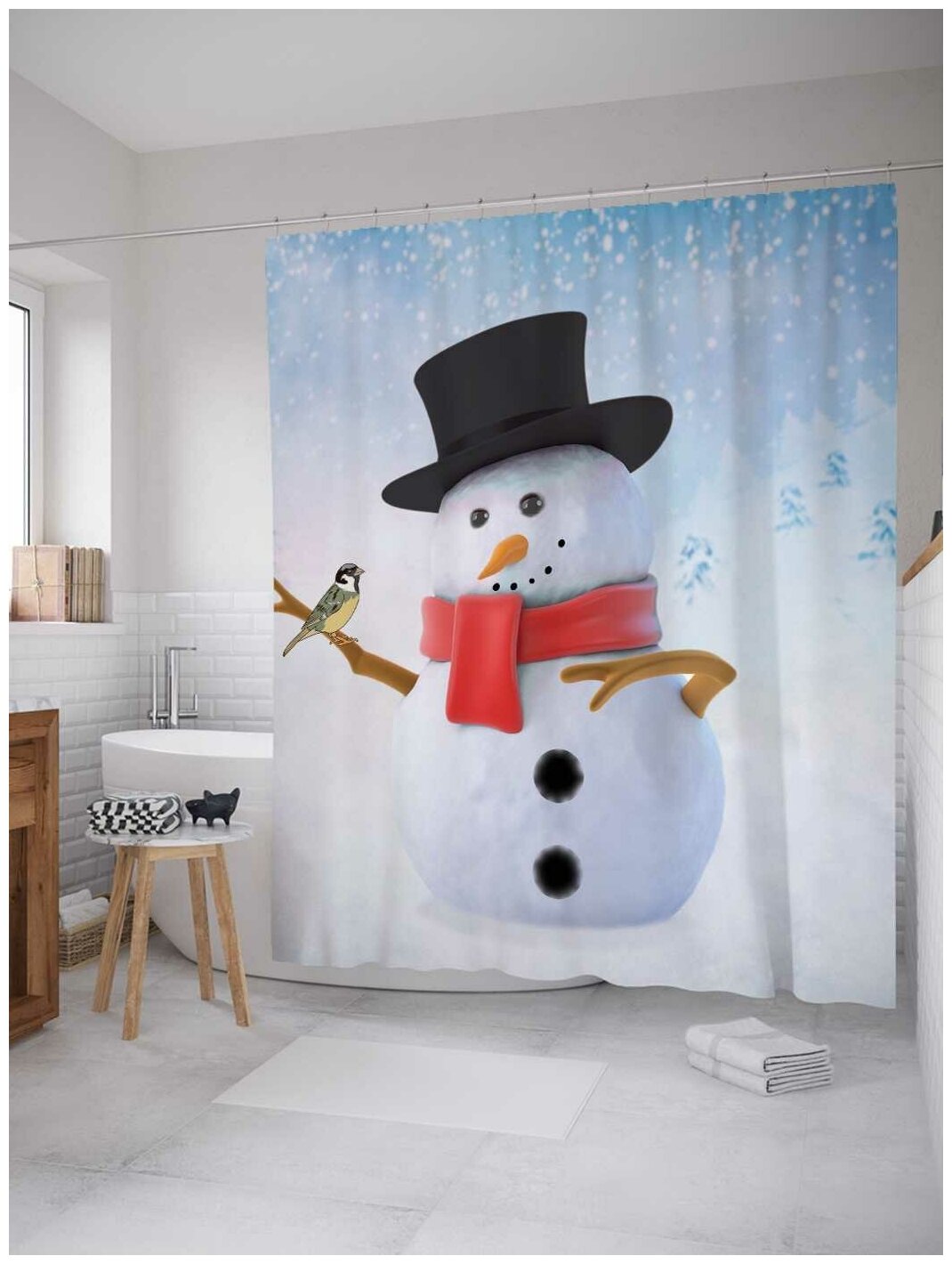 Штора для ванной JoyArty "Воробей и снеговик" из сатена 180х200 см с крючками Штора-занавеска для ванной из сатена с крючками Воробей и снеговик 200х180 см