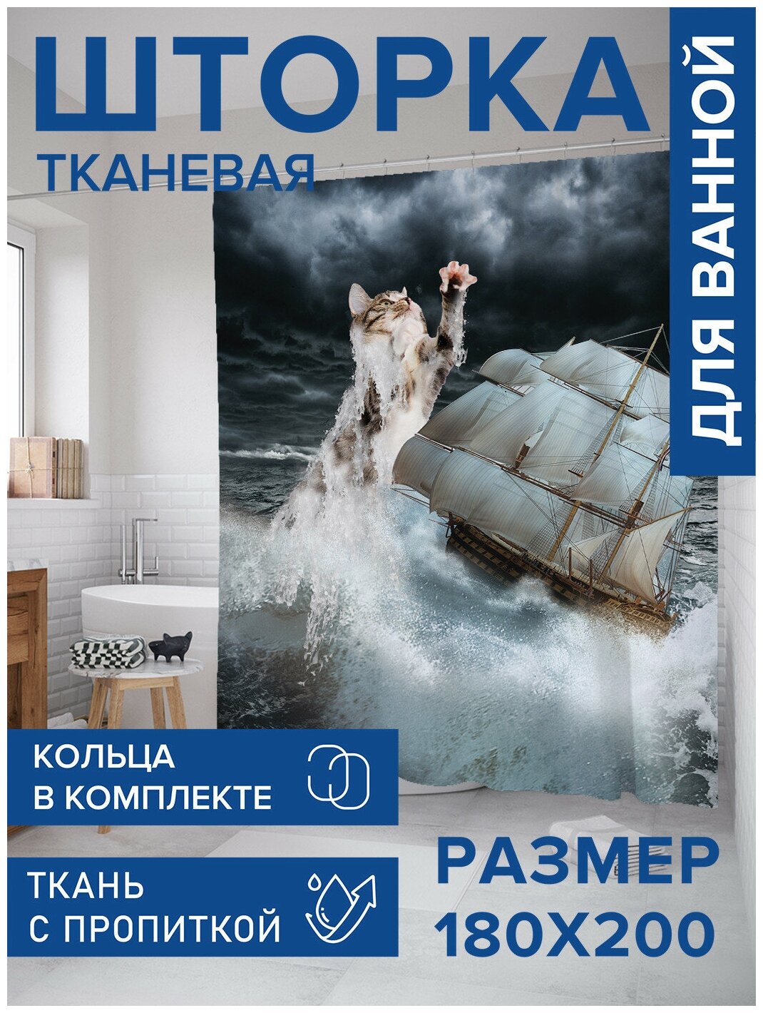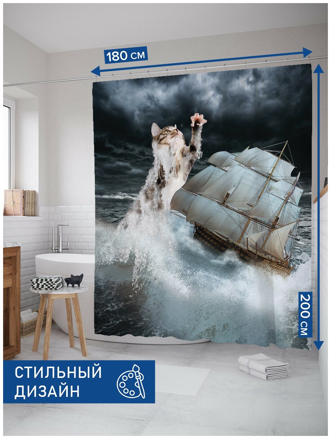 Шторка-занавеска для ванной JOYARTY Штора-занавеска для ванной из сатена с крючками Кот разрушает корабль 200х180 см (размер: 180х200)