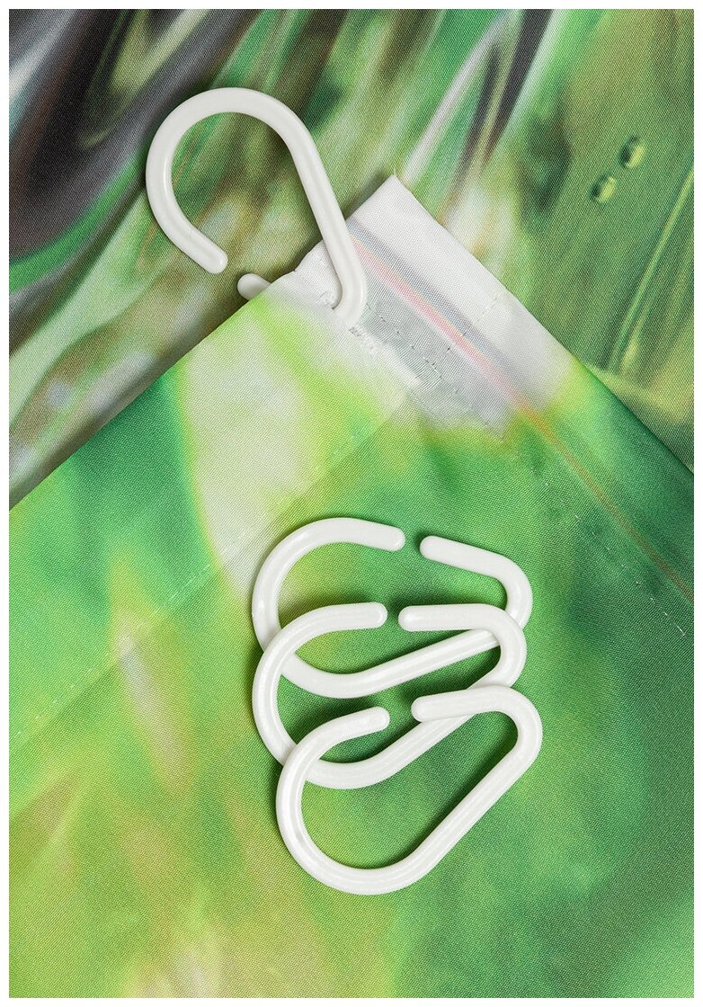 Красиво декорированная шторка, защищающая пол и оборудование ванной комнаты от брызг воды, изготовлена из полиэстера и обладает выраженными водоотталкивающими свойствами. Занавеска для ванной 180х200 комплектуется 12 прочными крючками из пластика и имеет в верхней части столько же обработанных на оверлоке отверстий. Декоративный рисунок нанесен на поверхность ткани при помощи фотопечати.