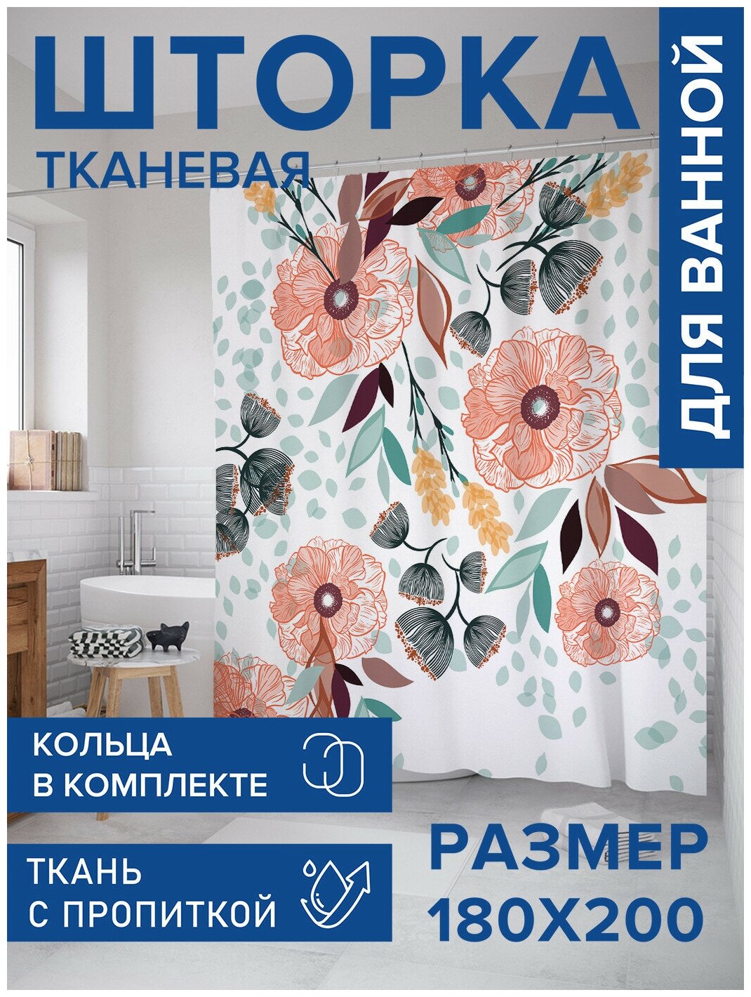 Красиво декорированная шторка, защищающая пол и оборудование ванной комнаты от брызг воды, изготовлена из полиэстера и обладает выраженными водоотталкивающими свойствами. Занавеска для ванной 180х200 комплектуется 12 прочными крючками из пластика и имеет в верхней части столько же обработанных на оверлоке отверстий. Декоративный рисунок нанесен на поверхность ткани при помощи фотопечати. Такие принты не боятся влаги и не смываются даже очень горячей водой.