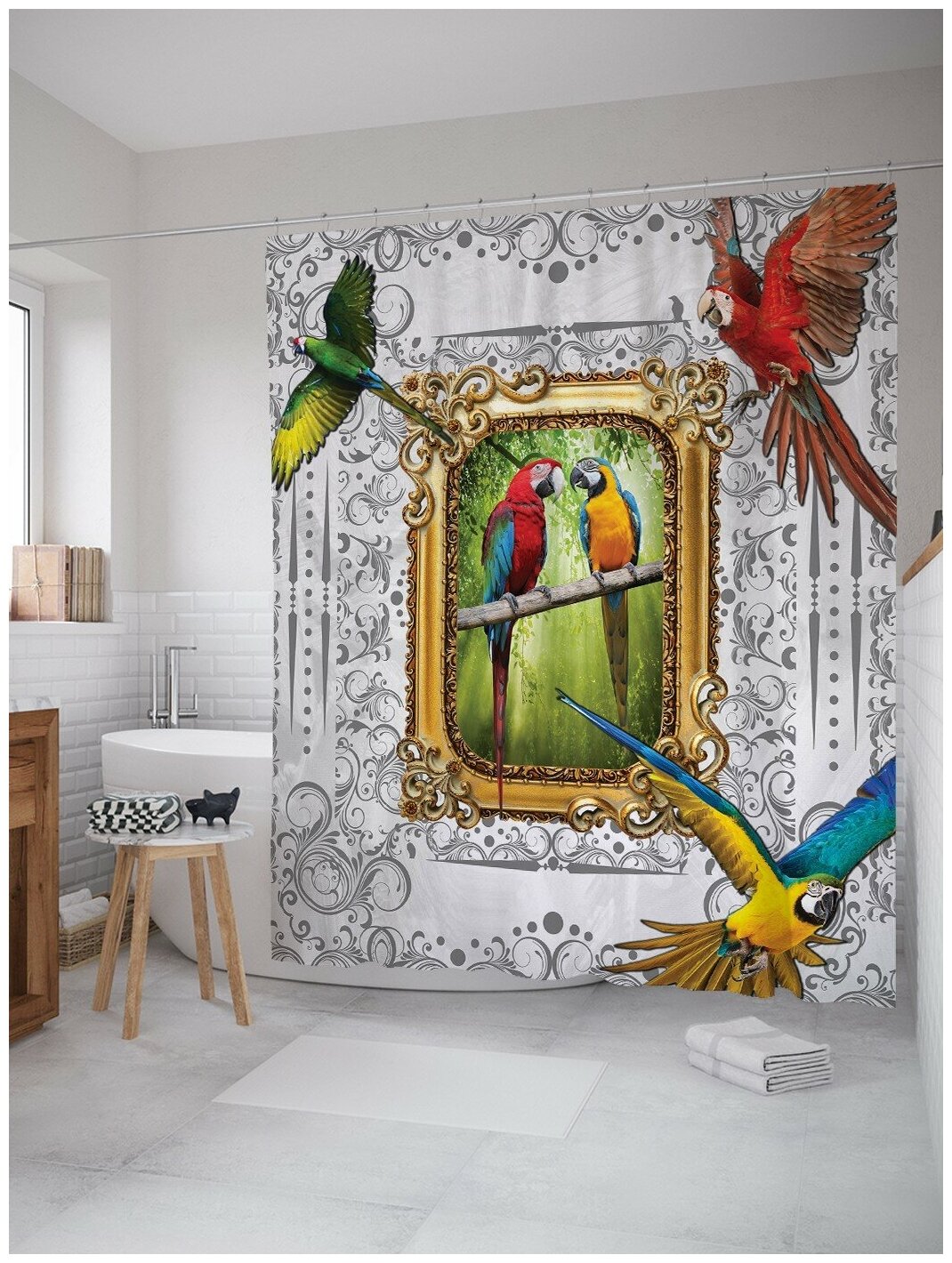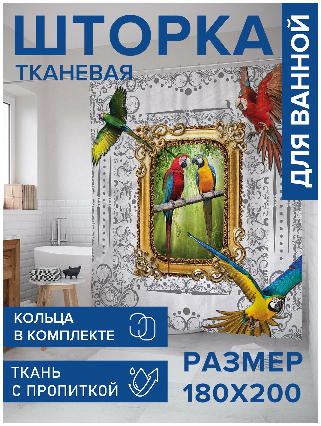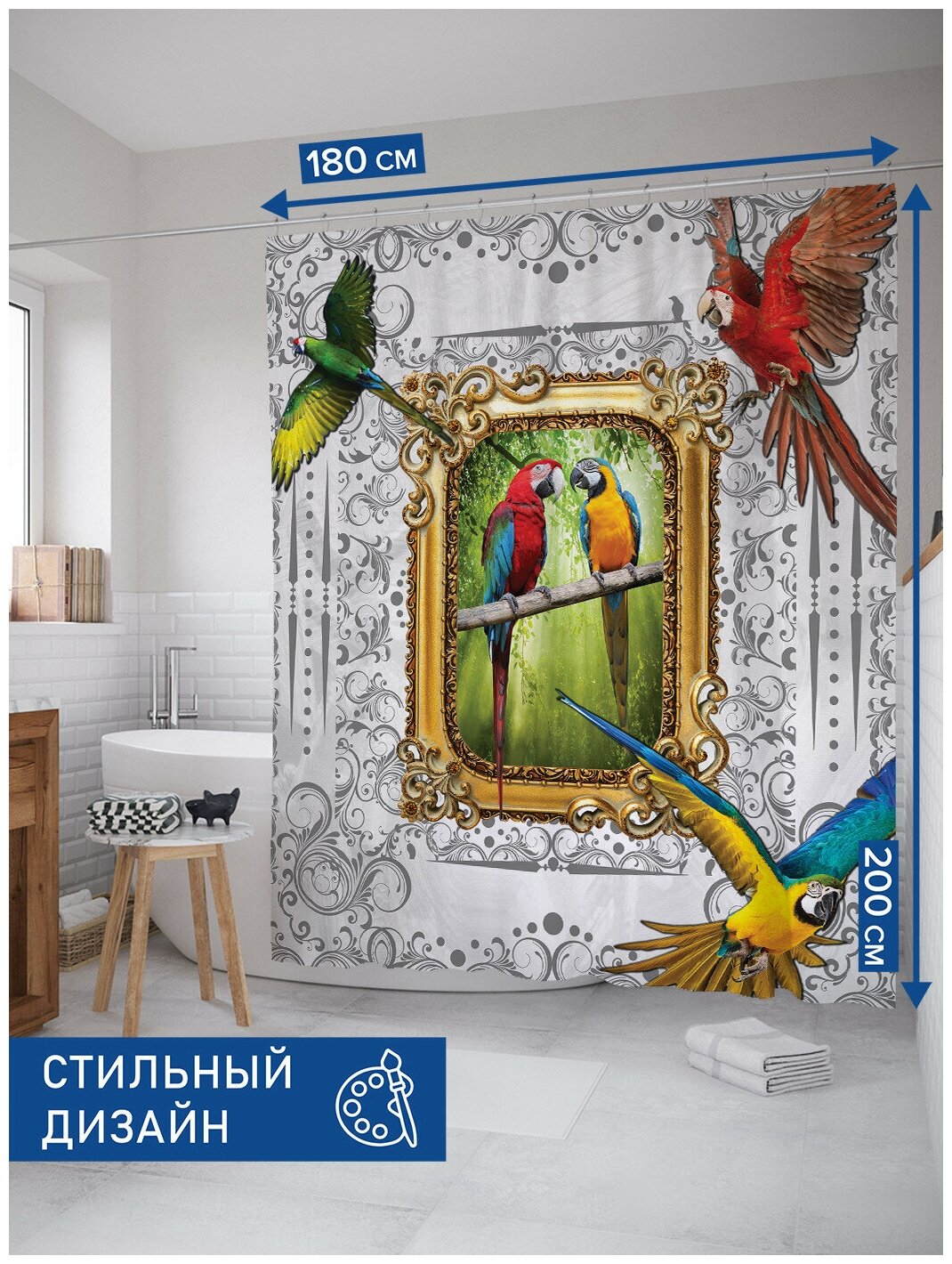 Штора для ванной JoyArty "Картина попугаев" из сатена 180х200 см с крючками Штора-занавеска для ванной из сатена с крючками Картина попугаев 200х180 см