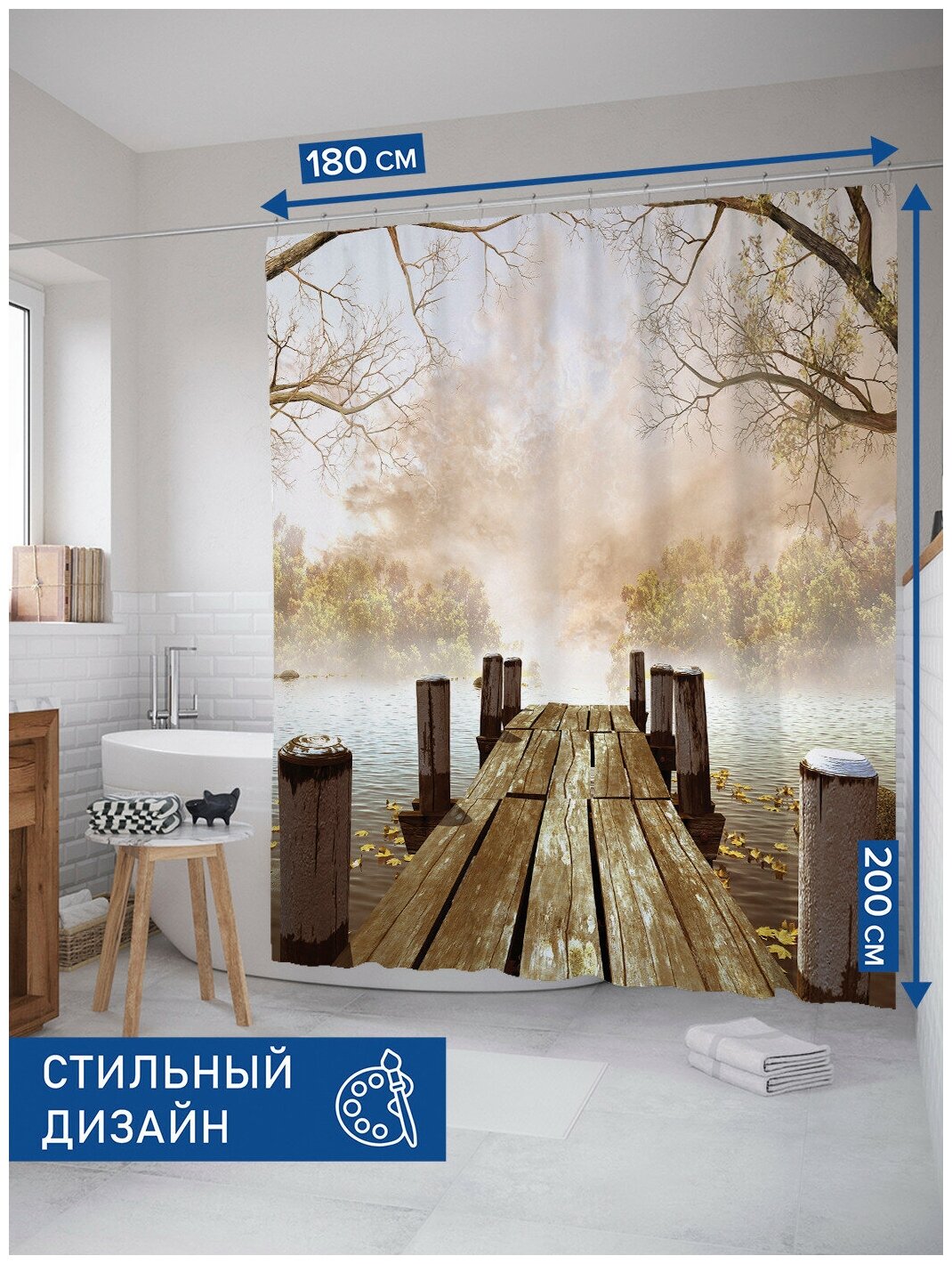 Красиво декорированная шторка, защищающая пол и оборудование ванной комнаты от брызг воды, изготовлена из полиэстера и обладает выраженными водоотталкивающими свойствами. Занавеска для ванной 180х200 комплектуется 12 прочными крючками из пластика и имеет в верхней части столько же обработанных на оверлоке отверстий. Декоративный рисунок нанесен на поверхность ткани при помощи фотопечати. Такие принты не боятся влаги и не смываются даже очень горячей водой.
